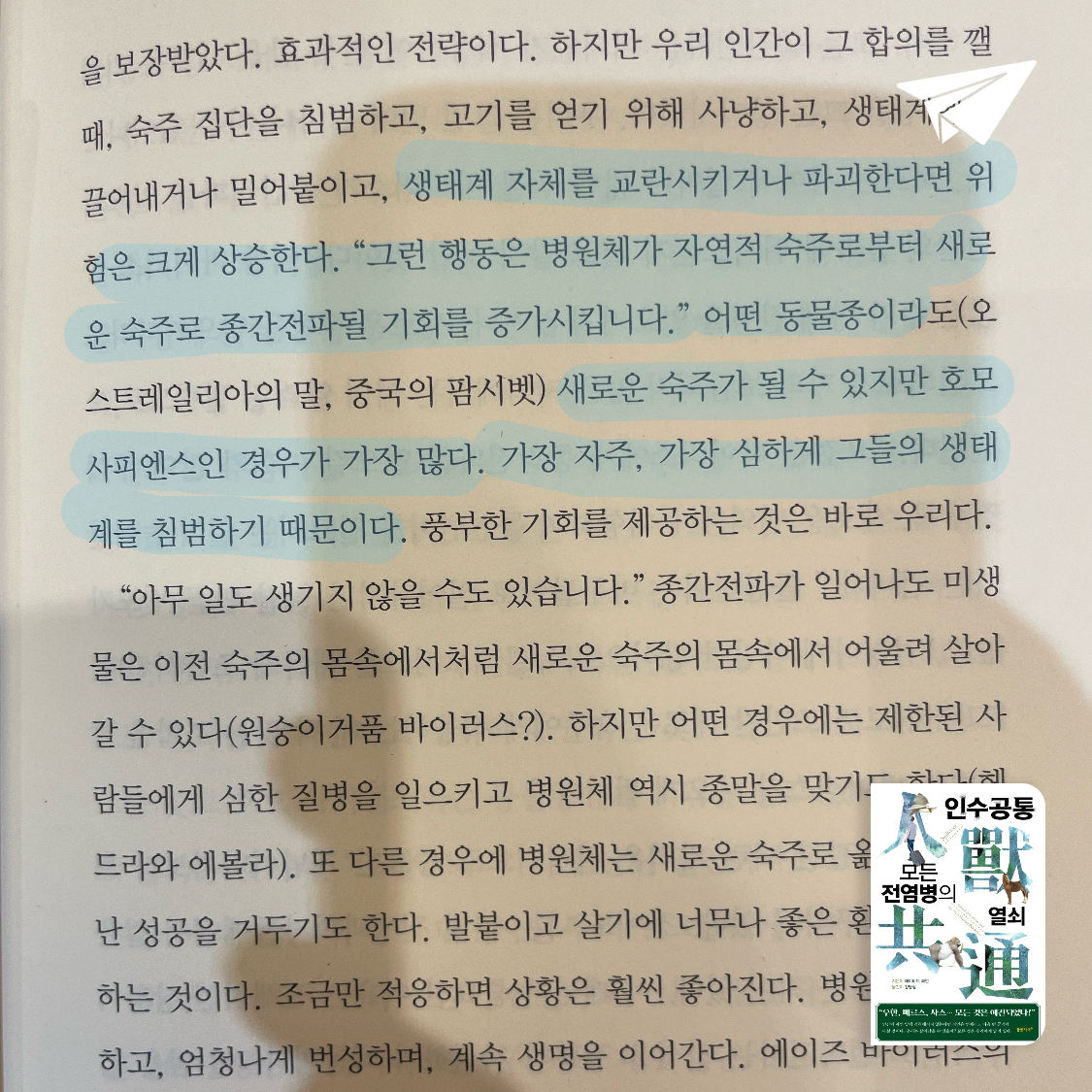 왜 동물의 병원체가 인간에게 건너올까? 인간과 동물이 접촉하기 때문이다. 인간의 숫자와 능력이 폭발적으로 늘어난 지금, 인간이 동물의 서식지를 무차별적으로 침범하면서 그 어느 때보다 늘고 있다. 이 책은 개성 넘치는 동물들과 무시무시한 병원체들이 사는 세계로 우리를 인도한다.