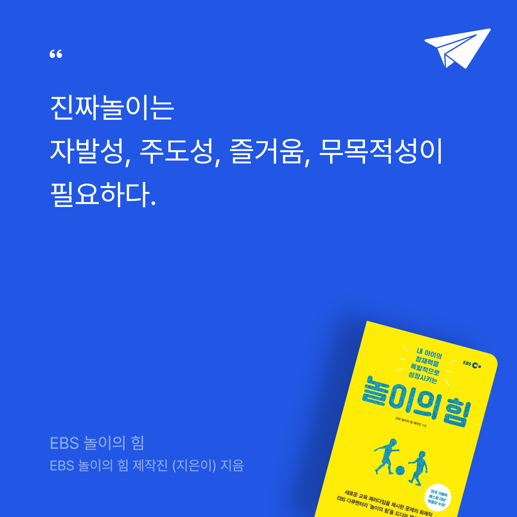 요약『EBS 놀이의 힘』(ISBN: 9788931589313)은 EBS 놀이의 힘 제작진이 성안당을 통해 2020년 5월 5일 출간한 육아 및 교육서로, EBS 다큐프라임 ‘놀이의 힘’(2019년 제29회 한국 가톨릭 매스컴 대상 특별상)을 바탕으로 제작되었다. 저자들은 김동관, 홍주영 등 다큐멘터리 제작진으로, 초록우산어린이재단의 ‘아동균형생활지표’(평일 여가 49분, 주말 2시간 미만)와 같은 데이터를 활용해 한국 유아교육의 문제점을 진단하고, 놀이 중심 교육의 중요성을 강조한다. 이 책은 놀이