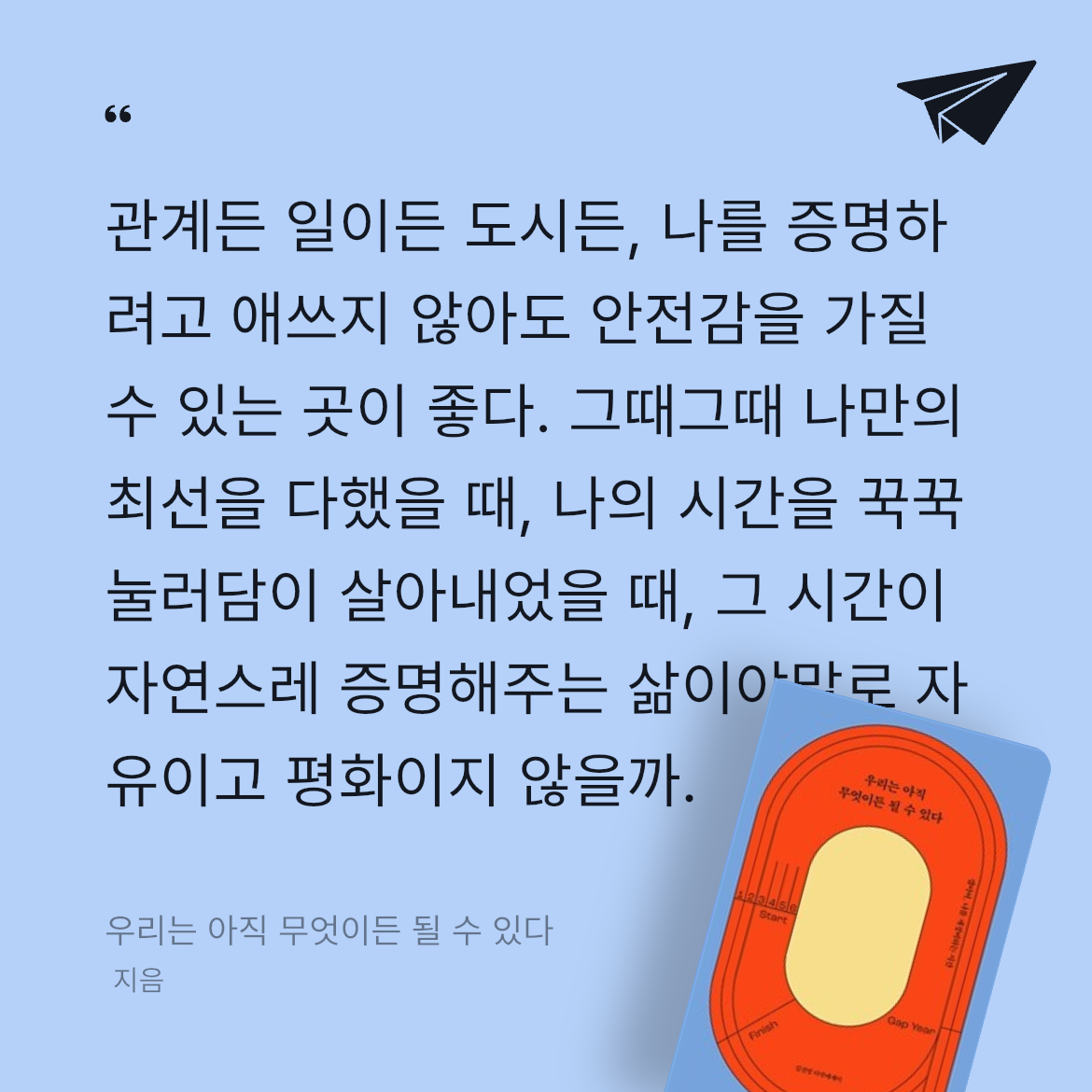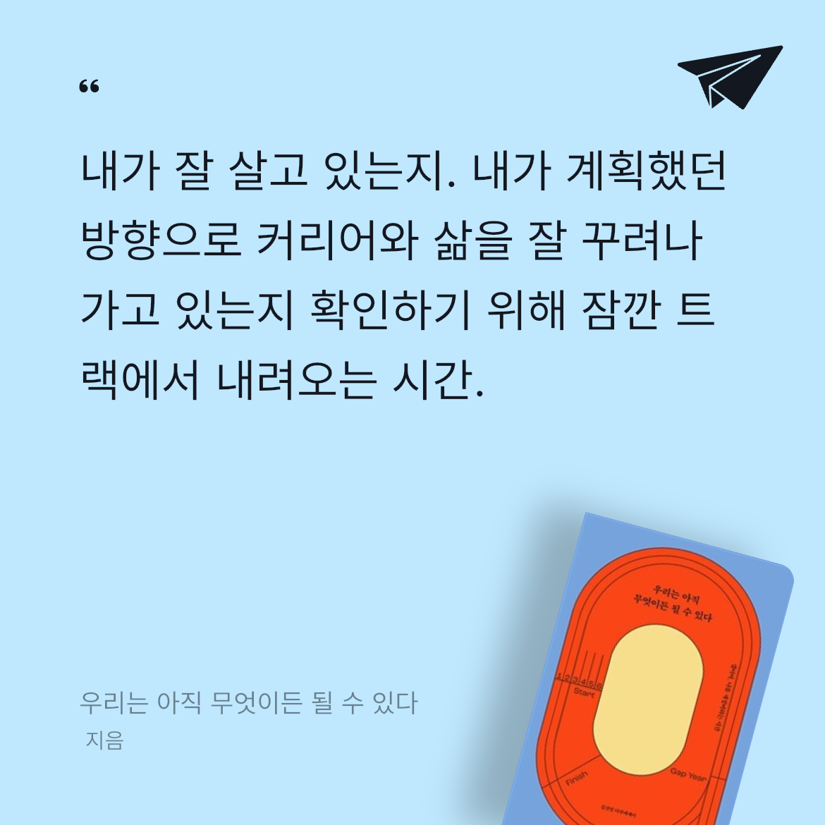 그렇다면 지금 내가 해야 하는 일은 불안과 자책으로 주저앉아 있을 게 아니라, 내가 다시 힘을 내어 달릴 수 있는 삶의 목표를 업데이트하는 일이다. 나를 다시 일으켜 세울 수 있는 답은 오직 내 안에 있다.