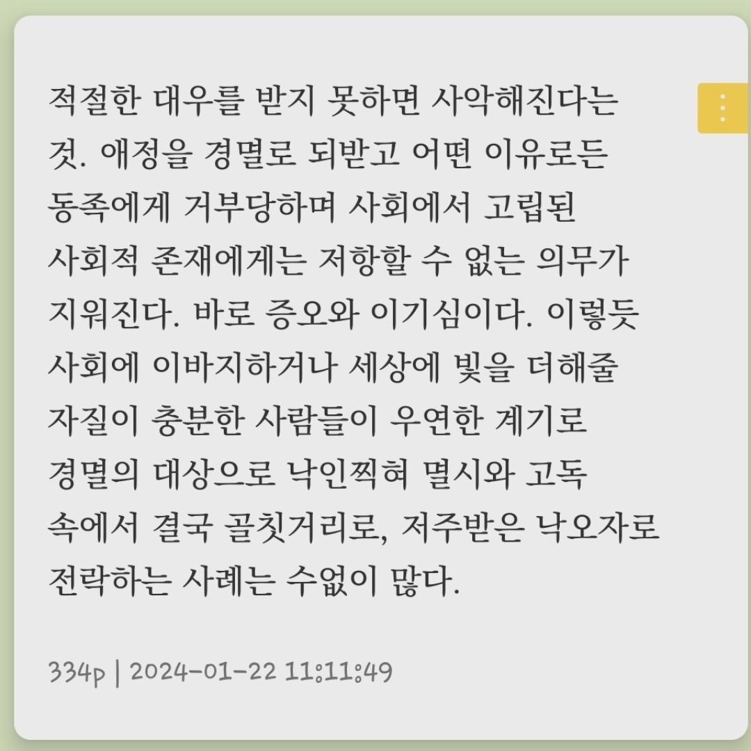 📃 ‘내가 생명을 얻게 된 날은 얼마나 끔찍한가! 저주받을 창조자! 어째서 스스로도 혐오감에 고개를 돌릴 만큼 끔찍한 괴물을 만들었단 말인가? 신은 자신의 모습을 본떠 아름답고 매혹적인 인간을 만들었는데, 나는 인간을 본떴음에도 추악하고 오히려 인간과 비슷해서 더 진저리 나는 형상이 됐지. 사탄에게도 칭송하고 격려해 주는 동료가 있었는데 나는 미움받는 외톨이로 살고 있구나.’