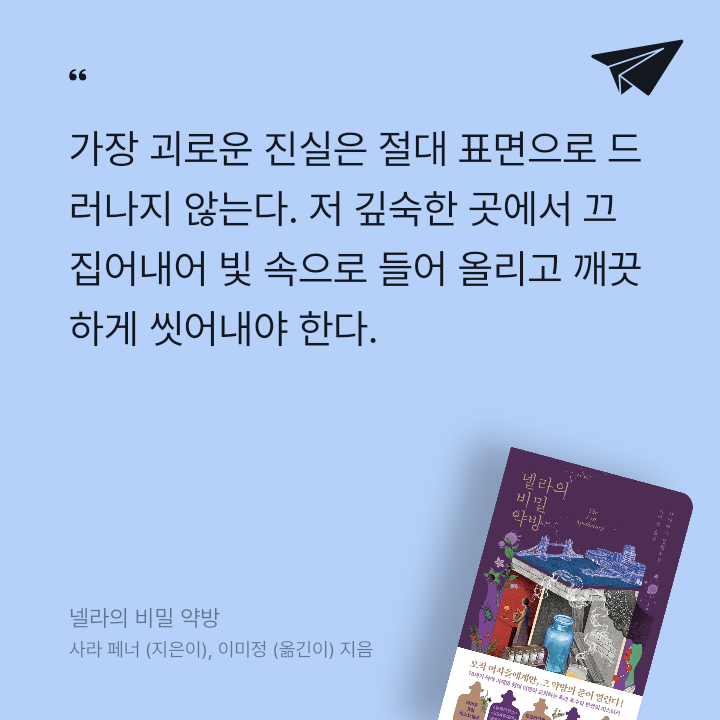 요약『넬라의 비밀 약방』은 사라 페너가 지은 역사 미스터리 소설로, 이미정 번역을 통해 2022년 5월 17일 하빌리스에서 출간되었다(ISBN: 9791168949751). 📘 YES24 판매지수 336과 리뷰 총점 9.5는 전 세계 40개국에서 번역된 이 데뷔작의 글로벌 인기를 보여준다()。 캔자스 대학교 회계학 졸업 후 금융업에서 일하던 저자는 엘리자베스 길버트의 강연에 감동받아 소설을 쓰기 시작했으며, 이 작품은 출간 즉시 베스트셀러에 올랐다()。 “여성의 고통과 복수