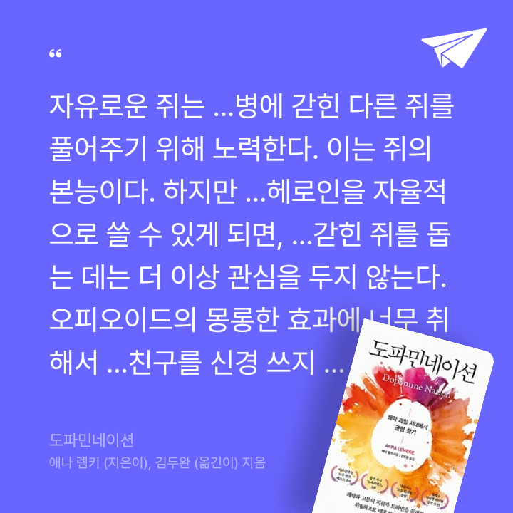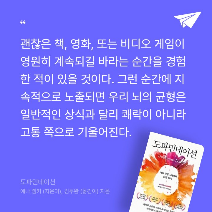 피로사회에서 도파민으로 버텨내는 현대인을 위한 인간, 뇌, 중독 그리고 회복에 대한 안내서. 인간이 중독에 빠지는 이유를 의지, 도덕성의 결핍이 아니라 쾌락과 고통을 지휘하는 신경물질, 도파민에서 찾고 있다.