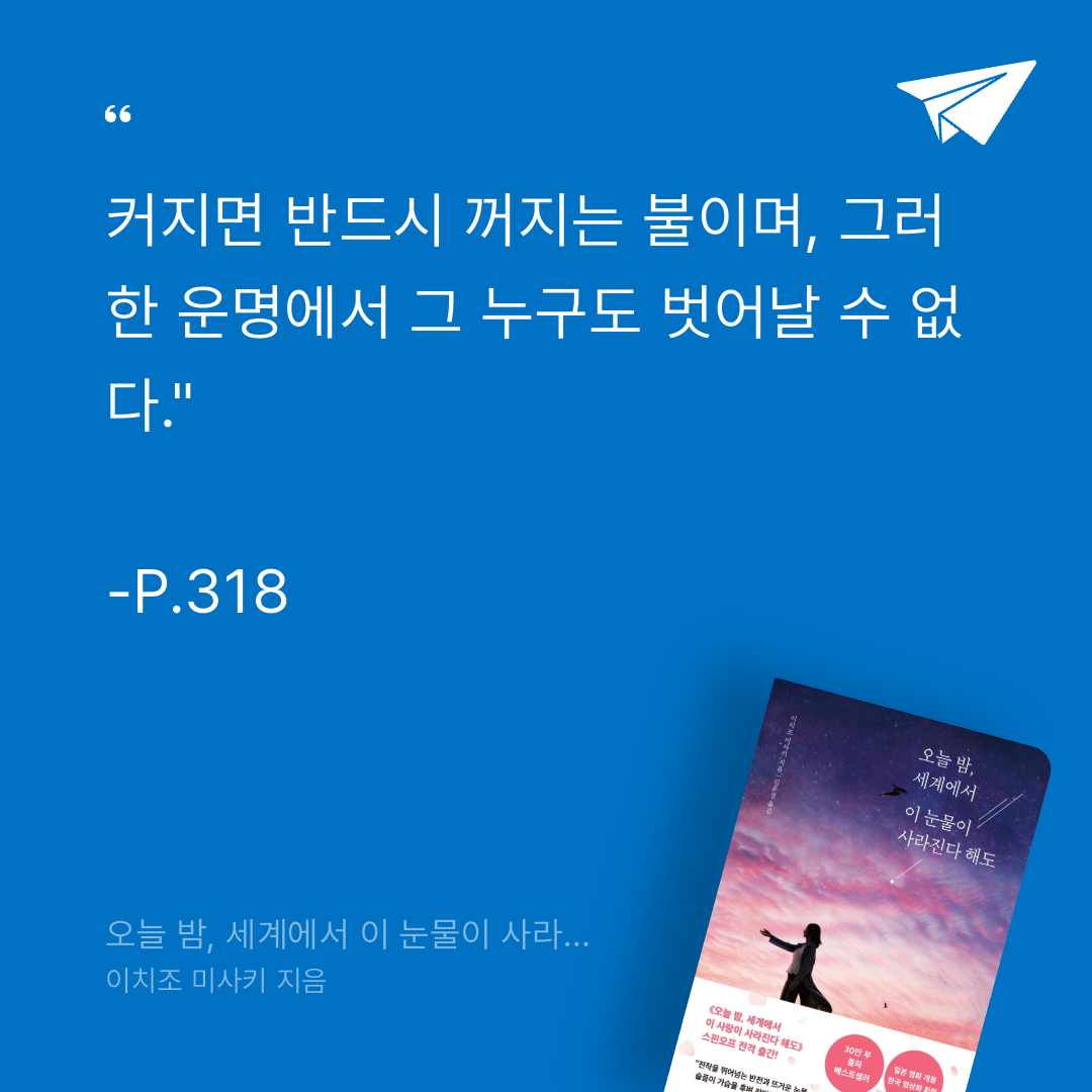 요약오늘 밤, 세계에서 이 눈물이 사라진다 해도는 이치조 미사키의 베스트셀러 오늘 밤, 세계에서 이 사랑이 사라진다 해도의 스핀오프 소설로, 전작의 감동을 잇는 가슴 아린 청춘 로맨스다. 📖 약 320쪽 분량의 이 책은 2022년 7월 모모 출판사에서 김윤경 번역으로 출간되었으며, 전작이 한국·일본·중국에서 50만 부 이상 판매된 성공을 바탕으로 독자들의 뜨거운 기대 속에 등장했다. 제26회 전격소설대상 미디어워크스문고상을 수상한 이치조 미사키는 치밀한 구성과 예