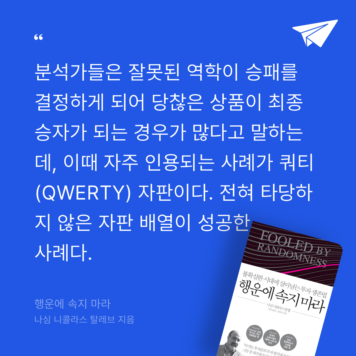 요약『행운에 속지 마라』는 나심 니콜라스 탈레브가 2001년 초판(국내 2016년, ISBN: 9788927808121)으로 출간한 투자와 인생 철학서로, 그의 ‘인세르토’ 시리즈(『블랙 스완』, 『안티프래질』)의 첫 작품이다. 📚 레바논 내전 속에서 자란 옵션 트레이더 출신 탈레브는 금융시장과 삶에서 행운과 무작위성이 미치는 영향을 탐구한다. 🧠 그는 성공과 실패가 기술이나 노력만으로 결정되지 않고, 우연과 행운에 크게 좌우된다고 주장한다. 이 책은 ‘행운의 바보’(실제 능력 없이 운으로 성공