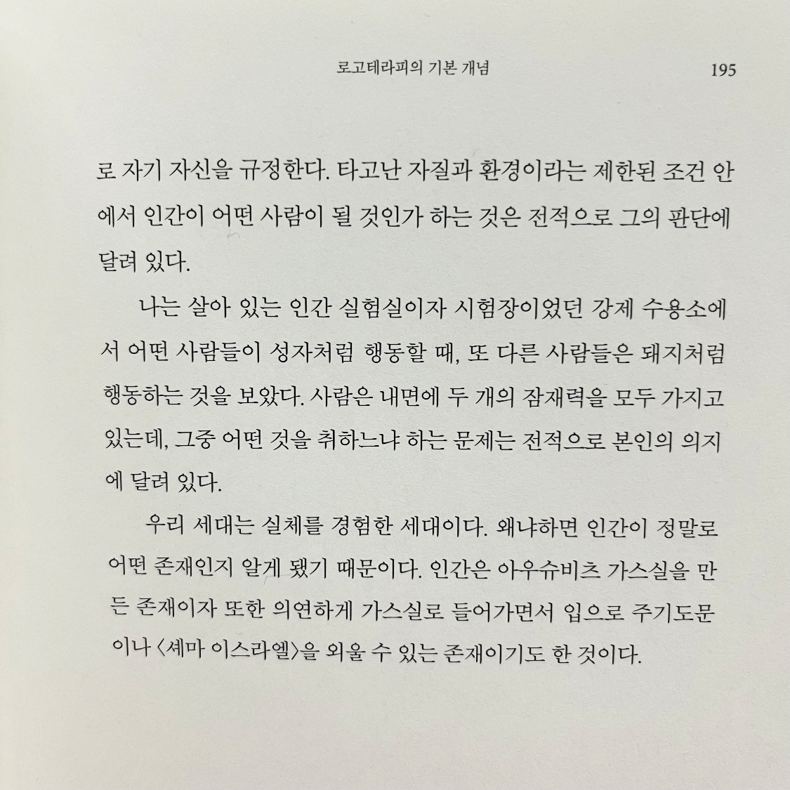 20세기를 대표하는 사상가이자 정신 의학자인 빅터 프랭클의 자전적인 에세이. 나치 강제 수용소에서 겪은 참혹한 고통을 건조하고 담담한 시선으로 술회한다.