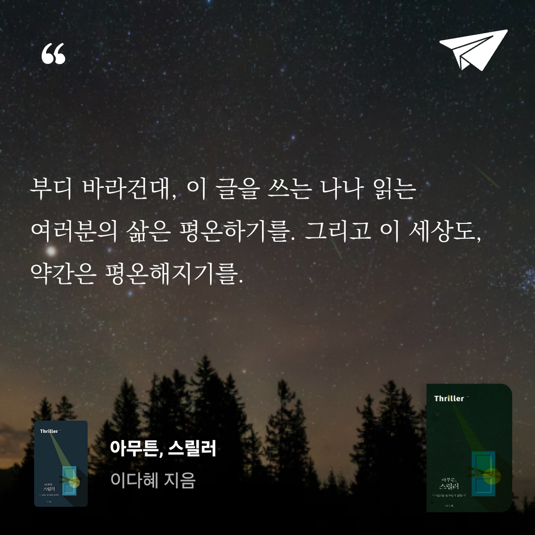 아무튼 시리즈 10권. 어린이용 셜록 홈즈와 애거사 크리스티 전집부터 가해자 가족들이 쓴 처절한 논픽션까지, 관악산 자락 방공호에 가득했던 음습한 기억들부터 강남역 살인사건 등으로 이어지는 현실의 이야기까지, 저자는 소설과 영화, 픽션과 논픽션, 과거와 현재, 실제와 허구를 넘나들며 스릴러라는 매력의 세계로 독자를 전도한다.