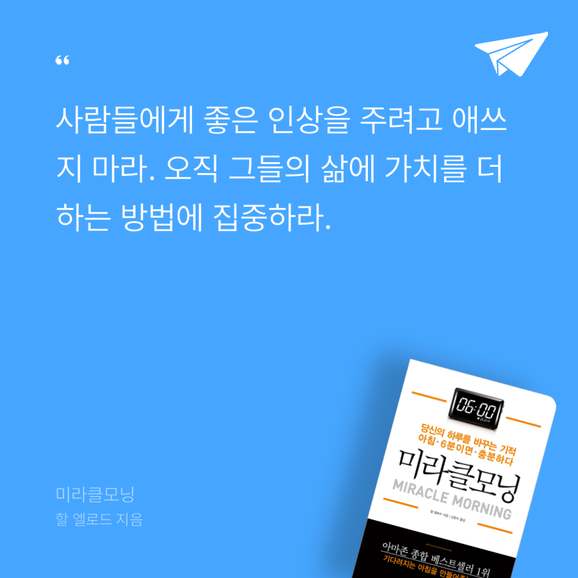 요약『미라클모닝 (당신의 하루를 바꾸는 기적 아침 6분이면 충분하다)』은 할 엘로드(Hal Elrod)가 지은 자기계발서로, 한빛비즈에서 2016년 2월 22일 김현수 번역으로 출간되었다. 📖 ISBN 9791157841110을 가진 이 248쪽 분량의 책은 아마존 종합 베스트셀러 1위에 오르며, 출간 첫해 최고 평점을 받은 작품이다. 저자는 20세에 교통사고로 6분간 사망 상태에 이르고, 영구적 뇌 손상과 11곳의 골절로 걷지 못할 것이라는 진단을