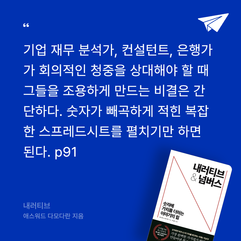 요약『내러티브: 숫자에 가치를 더하는 이야기의 힘』은 애스워드 다모다란이 2020년 5월 한빛비즈에서 출간한 경제경영서로, 조성숙이 번역하고 강병욱이 감수하여 ISBN 9791157843763으로 기록되었다. 📖 약 464페이지로 구성된 이 작품은 YES24 리뷰 총점 9.0(98건), 판매지수 5,340을 기록하며, “기업 가치평가를 스토리텔링과 숫자로 혁신한 필독서”로 평가받는다(). 뉴욕대 스턴 경영대학원 재무학 교수인 다모다란은 『투자철학』, 『주식 가치평가를 위한 작은 책』 등으로 ‘가치평가의 석