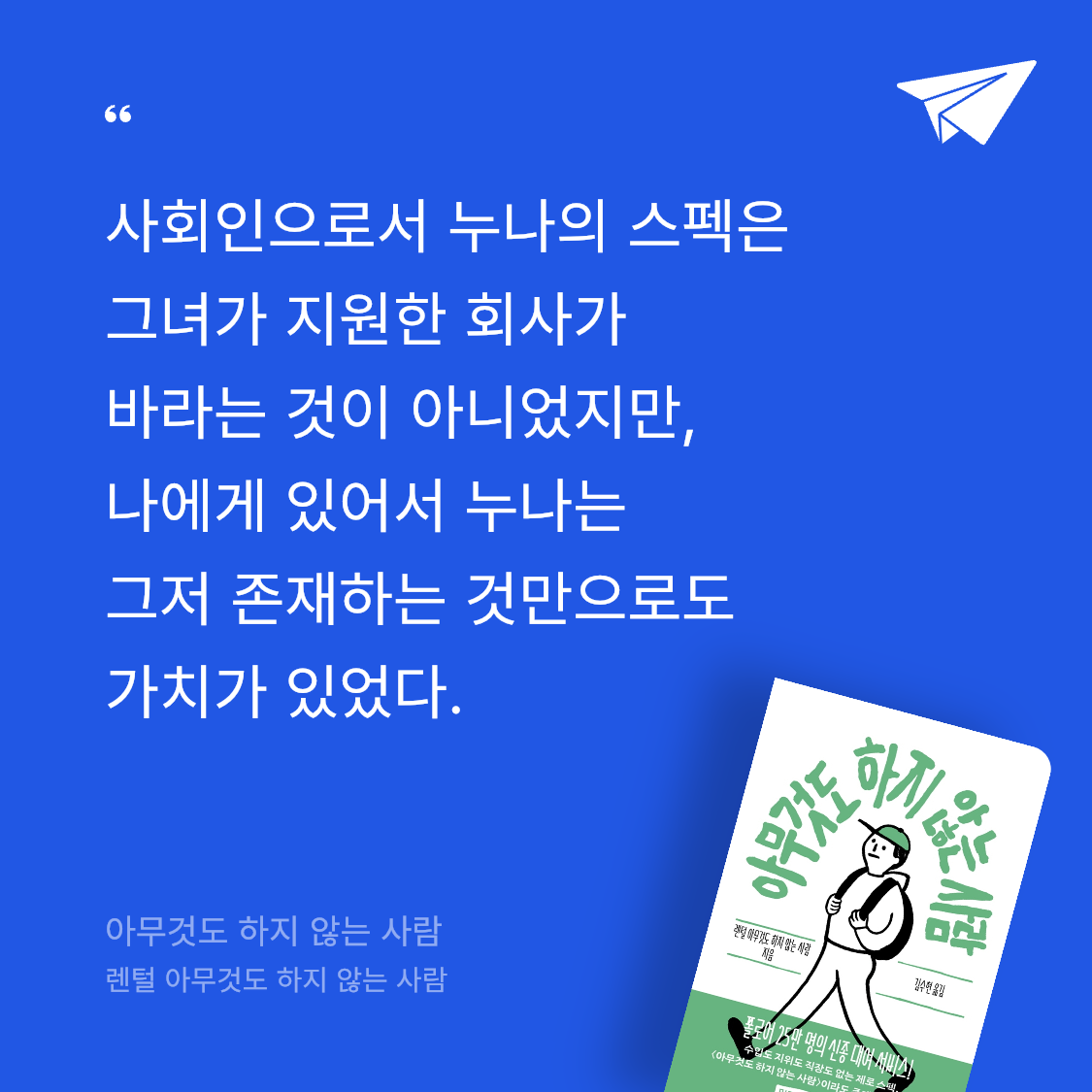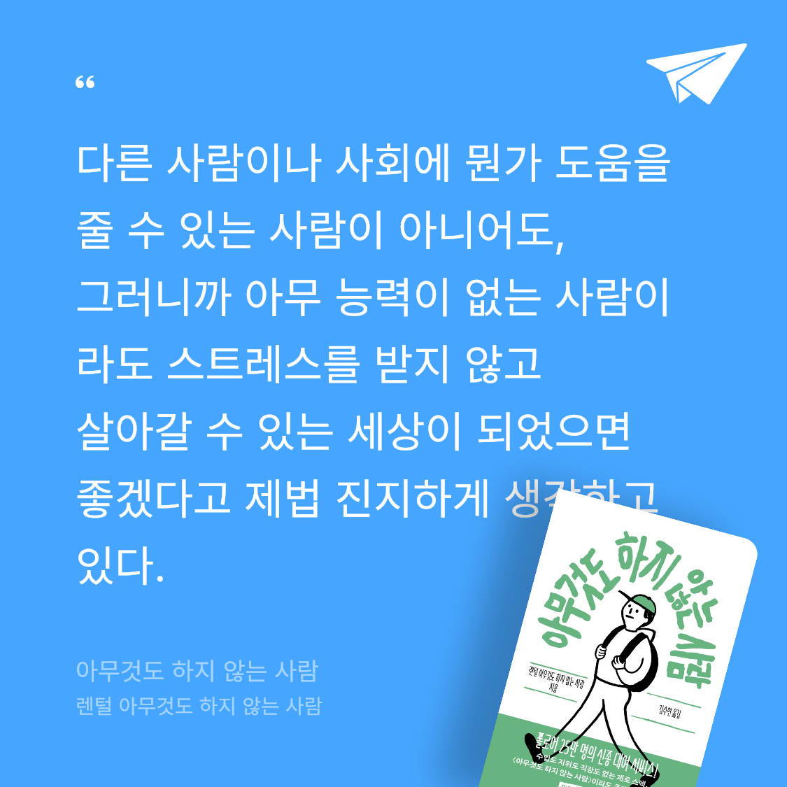 전대미문의 대여 서비스를 다룬 책. 이 책은 SNS에 올린 짧은 글로 시작해 일본에서 커다란 반향을 불러일으키며 다큐멘터리로, 책으로, 만화로, TV 드라마로 만들어진 아무것도 하지 않는 사람을 빌려주는 신종 대여 이야기다.