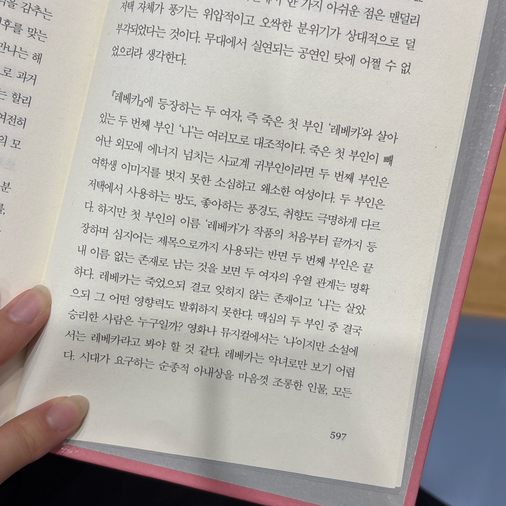 요약젊고 소심한 성격의 주인공 ‘나’는 부유한 상류층 여성의 말동무로 일하며 지루하고 고단한 삶을 살아가고 있었습니다. 그러던 중 몬테카를로의 한 호텔에서 우연히 영국 콘월의 대저택 ‘맨덜리’의 주인인 막심 드 윈터를 만나게 됩니다. 십여 년 전 아내 레베카를 사고로 잃고 상심에 빠져 있던 막심은 순수하고 조용한 주인공에게 깊은 관심을 보이고, 두 사람은 짧은 교제 끝에 결혼식을 올립니다. 💍