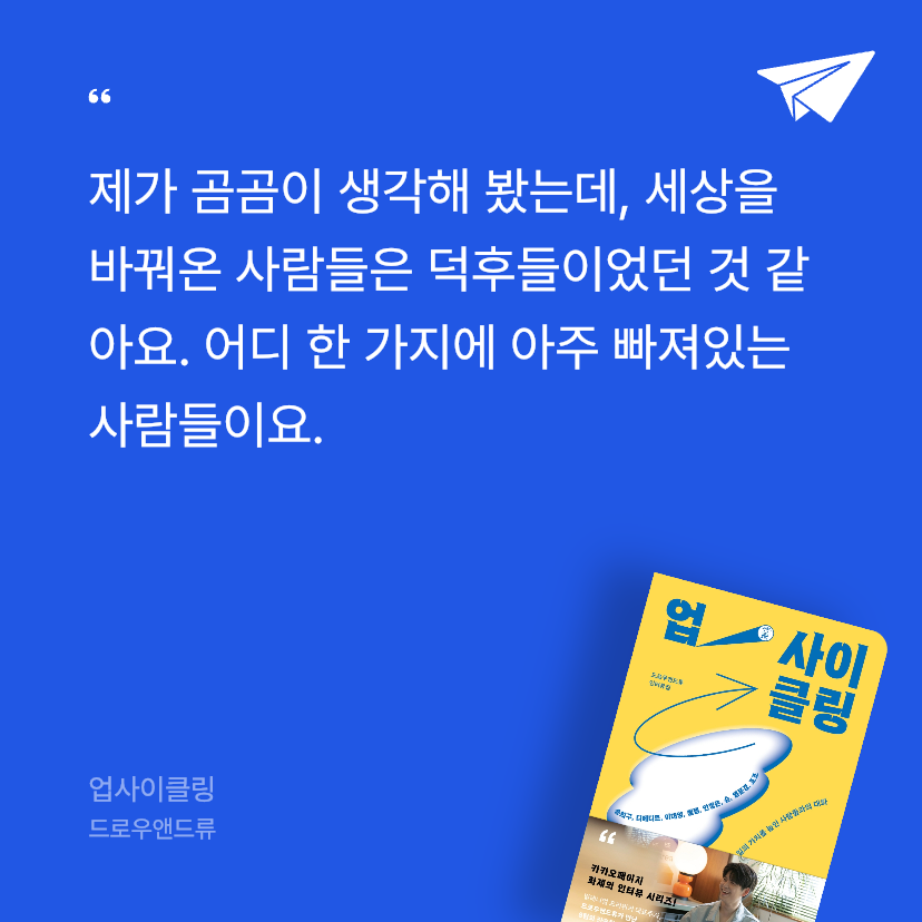 65만 구독자가 열광하는 두 개의 유튜브 채널을 운영하며 자신의 브랜드를 확장하고 있는 크리에이터 ‘드로우앤드류’. 밀레니얼 세대가 열광하는 프리워커의 대표주자가 되기까지 쉽지만은 않은 길을 걸어온 그는 독자들이 자신의 커리어패스에 든든한 동료를 얻길 바라는 마음으로, 나답게 일하며 성장하는 8팀의 인터뷰이를 만나 내밀한 이야기를 나누었다.