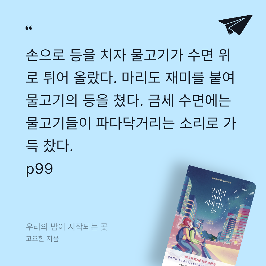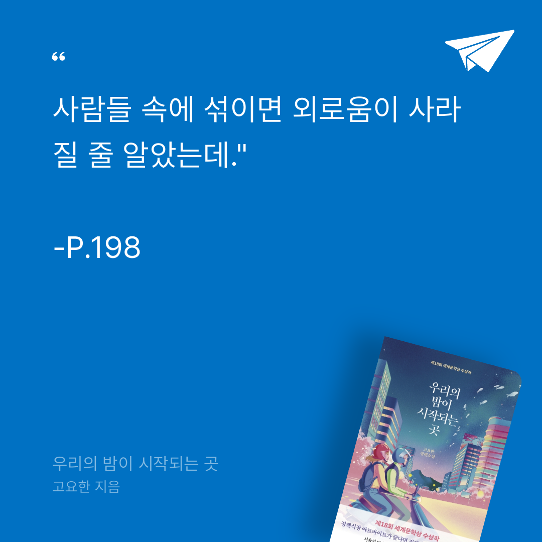 요약우리의 밤이 시작되는 곳은 고요한이 2022년 5월 13일 나무옆의자에서 출간한 장편소설로(ISBN: 9791161571317), 제18회 세계문학상을 수상한 작품이다. 📖 232쪽 분량의 이 소설은 “죽음은 끝이 아니라 새로운 시작”이라는 메시지를 중심으로, 장례식장에서 아르바이트를 하는 20대 청춘 재호와 마리가 서울의 밤거리를 떠돌며 삶과 죽음, 트라우마와 성장을 성찰하는 이야기를 그린다(web:6, web:23). 고요한은 2016년