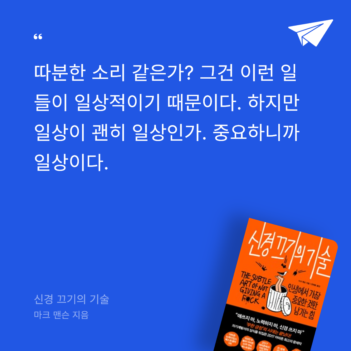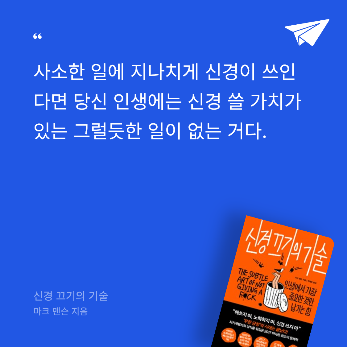 요약마크 맨슨의 *신경 끄기의 기술 (인생에서 가장 중요한 것만 남기는 힘)*은 2017년 갤리온에서 출간된 자기계발서로, 전 세계적으로 1,300만 부 이상 판매된 베스트셀러다. 📖 저자는 미국의 작가이자 블로거로, 이 책에서 흔히 알려진 긍정 사고와 행복 추구의 허상을 깨고, 삶에서 정말 중요한 가치를 선택해 신경 쓸 필요 없는 것들을 내려놓는 기술을 제시한다. 책은 9개의 장으로 나뉘며, 직설적이고 유머러스한 문체로 독자를 사로잡는다. 첫 장 “너무