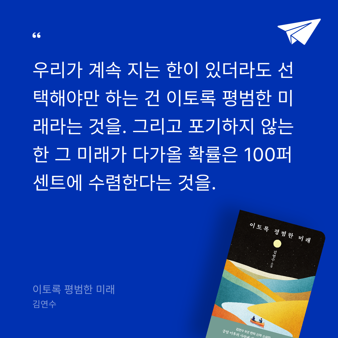 요약《이토록 평범한 미래》는 김연수의 여섯 번째 단편소설집으로, 2022년 문학동네에서 출간되었다(ISBN: 9788954680004). 『사월의 미, 칠월의 솔』(2013) 이후 9년 만의 신작으로, 작가가 지난 시간을 성찰하며 ‘시간’과 ‘이야기’를 새롭게 정의한 작품이다. 여덟 편의 단편—「이토록 평범한 미래」, 「난주의 바다 앞에서」, 「진주의 결말」, 「바얀자그에서 그가 본 것」, 「엄마 없는 아이들」, 「다만 한 사람을 기억하네」, 「사랑의 단상 2014」, 「다시