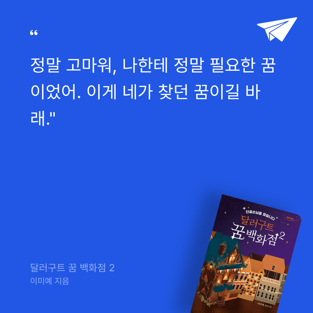 요약**달러구트 꿈 백화점 2(큰글자도서) (이미예 장편소설)**은 한국 작가 이미예가 2021년 7월 27일 팩토리나인을 통해 출간한 힐링 판타지 소설로, 2020년 베스트셀러 《달러구트 꿈 백화점》의 후속작이다(ISBN: 9791165345686). 📖 이미예는 부산대 재료공학과 졸업 후 반도체 엔지니어로 일하다 퇴사하고 텀블벅 펀딩을 통해 첫 소설을 발표, 100만 부 이상 판매된 이 시리즈로 전미도서상 후보에 오른 최초의 한국 SF 작가가 되었다. 이