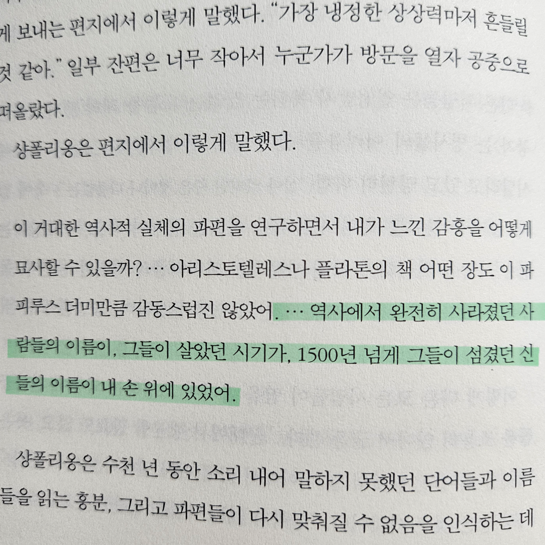 독자들도 이해할 수 있도록 해석자인 샹폴리옹의 사고과정을 쉽게 풀어주기도 했고, 중간 중간 이집트의 건축물과 실제 성체자가 쓰여진 유물의 사진이 첨부되어 있다. 역사나 이집트에 관심이 있는 독자라면 누구나 재밌어할 책이다. 😊