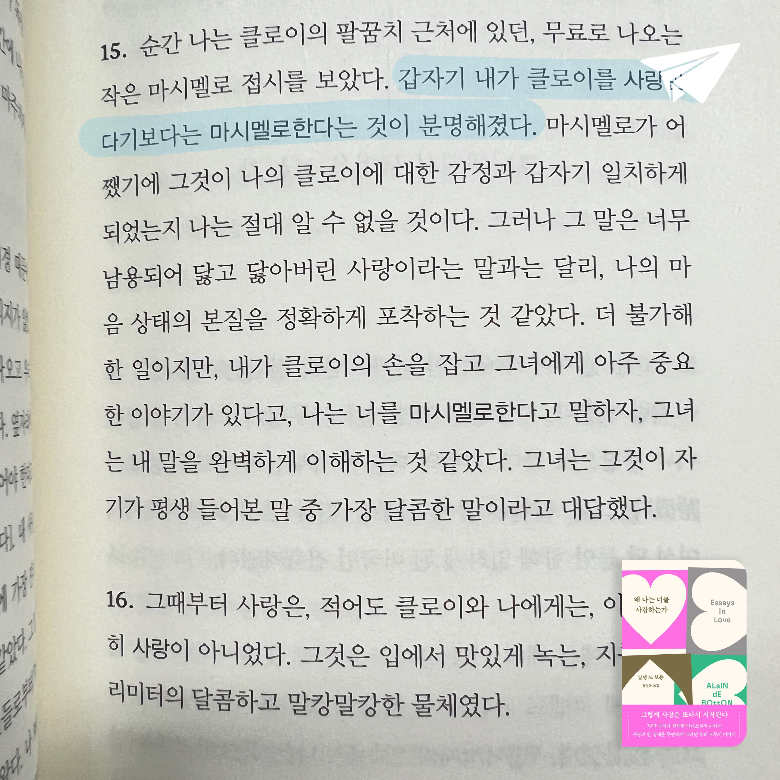 요약《왜 나는 너를 사랑하는가(70만 부 기념 리커버)》는 알랭 드 보통의 대표작으로, 1993년 첫 출간 이후 30개국에서 베스트셀러를 기록하며 국내에서 70만 부 판매를 기념해 2022년 11월 청미래에서 새 표지로 재출간되었다. 📖 이 소설은 런던과 파리를 오가는 비행기에서 우연히 만난 ‘나’와 클로이의 사랑 이야기를 통해 연애의 감정과 딜레마를 철학적으로 탐구한다. “사랑에 빠지는 행위는 자기 자신의 허점을 넘어서고 싶어 하는 인간 희망의 승리이다”라는 문장