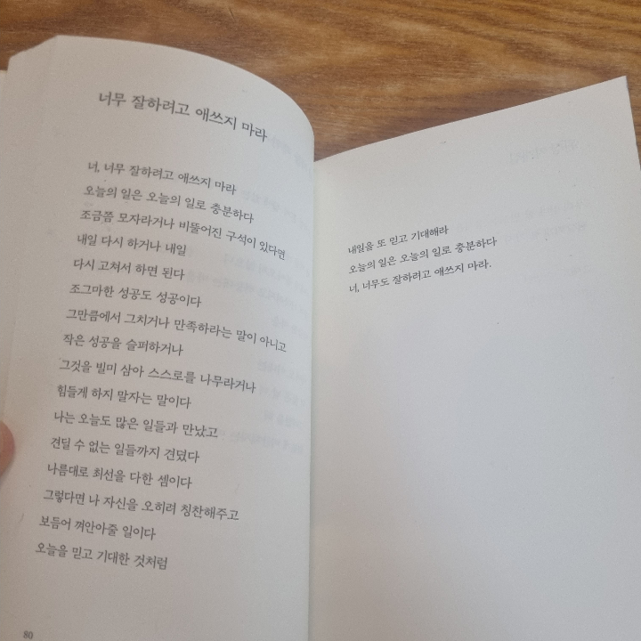 요약《너무 잘하려고 애쓰지 마라》(ISBN: 9791170400608)는 풀꽃 시인 나태주가 2022년 6월 1일 열림원에서 출간한 신작 시집으로, 코로나19 팬데믹으로 고달팠던 2020년 2월부터 2022년 2월까지 약 2년간 매일 또는 매주 한 편씩 쓴 176편의 시를 담았다. 📖 나태주는 1971년 서울신문 신춘문예 당선 이후 《대숲 아래서》, 《풀꽃》, 《꽃을 보듯 너를 본다》 등 150여 권의 시집과 산문집을 펴내며 국민적 사랑을 받은 시인이다. 이 시집은 그의