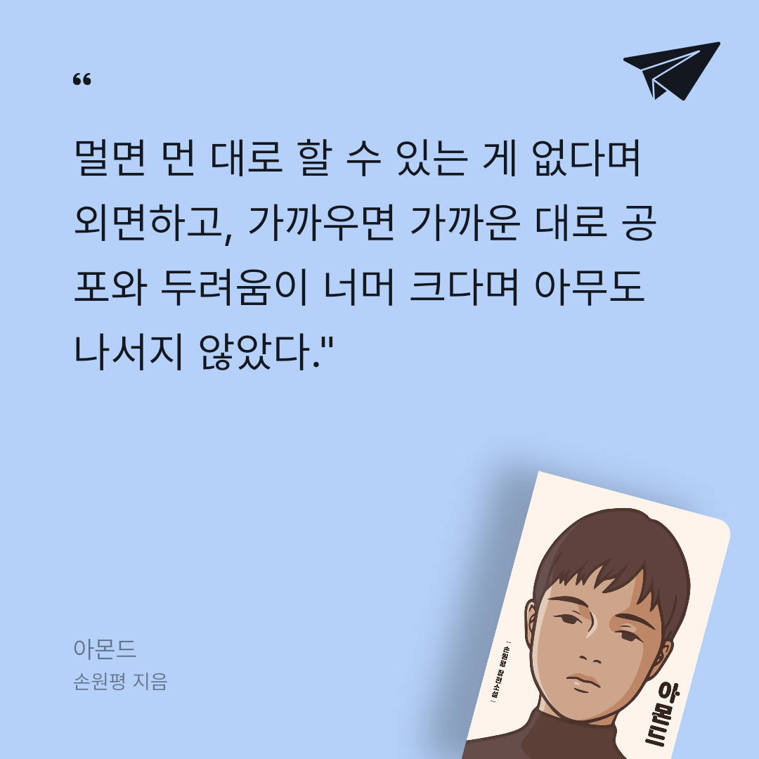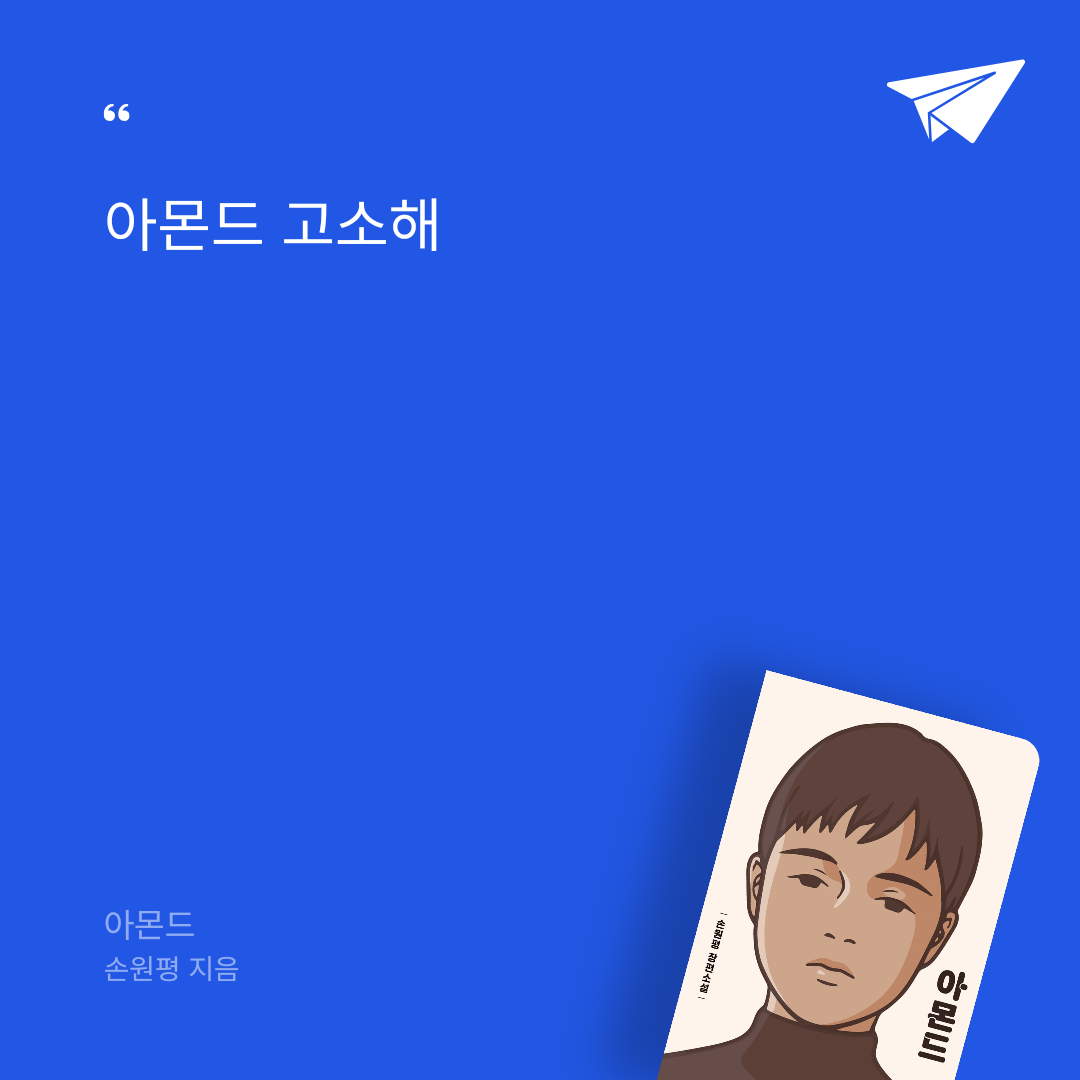 요약**아몬드 (양장)**은 손원평이 2017년 창비에서 출간한 첫 장편소설로, 제10회 창비 청소년문학상과 제17회 일본 서점대상 번역소설 부문을 수상하며 국내외에서 100만 부 이상 판매된 베스트셀러다. 📖 서강대 사회학·철학을 전공하고 한국영화아카데미에서 영화 연출을 공부한 저자는, 영화적 문체와 속도감 있는 전개로 감정표현불능증(알렉시티미아)을 앓는 소년의 성장 이야기를 그린다. ‘공감 불능’ 사회에서 타인과 관계 맺으며 성장하는 과정을 통해 “공감은 우
