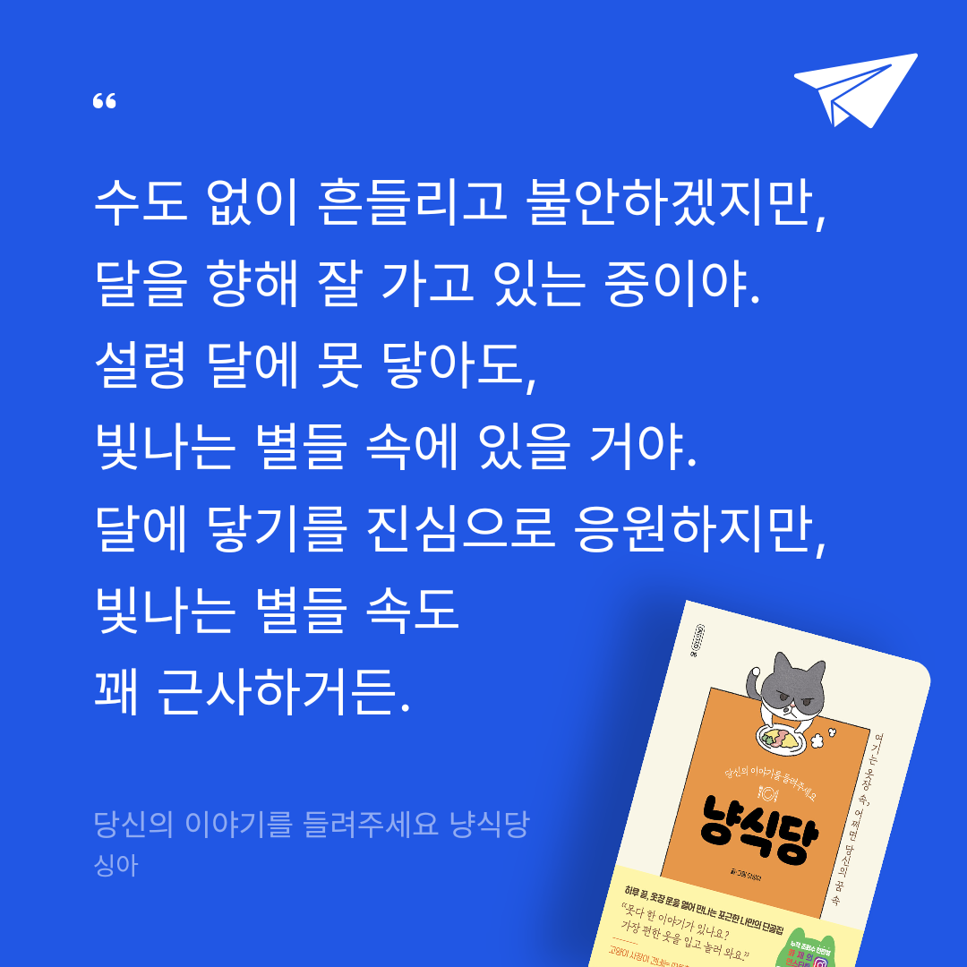 <냥식당>은 싱아 작가의 첫 단행본으로 2022년 초 인스타그램을 통해 <냥식당> 공개, 따뜻한 힐링 스토리로 13만 팔로워의 열렬한 사랑을 받으며 2022년 12월 지금, 이 순간에도 연재되고 있다. 이번 단행본은 연재된 작품 중 독자들의 사랑을 받은 에피소드를 엄선하고, 미공개 에피소드 11편과 냥식당 일상 흑백 만화 4컷을 담은 특별한 소장판이다.