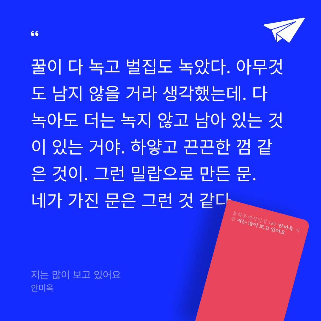 요약《저는 많이 보고 있어요》는 안미옥 시인의 세 번째 시집으로, 2012년 동아일보 신춘문예 당선 이후 꾸준히 주목받아온 시인의 섬세한 시세계를 담고 있다. 2023년 문학동네시인선 187번으로 출간된 이 시집은 총 46편의 시를 3부로 나누어 구성하며, 제64회 현대문학상 수상작 「지정석」과 시소 프로젝트 ‘2022 봄의 시’로 선정된 「사운드북」 등을 포함한다. 안미옥은 일상과 관계, 특히 ‘집’이라는 공간을 중심으로 삶의 미세한 순간들을 포착하며, ‘보다’라는 행위