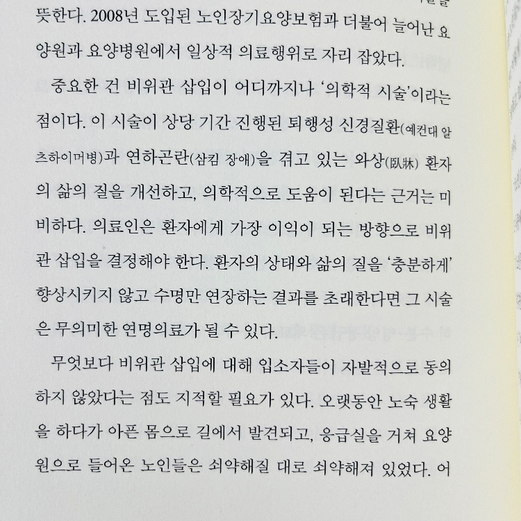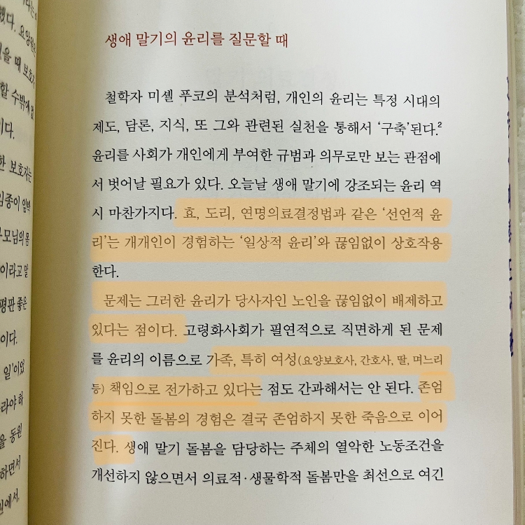 _첫 장에서부터 책의 핵심 주제를 짚는 느낌이었다. 매스컴을 통해서 접하고 주위에서 듣는 돌봄과 간병, 임종에 관한 현실의 풍경을 건조하게 말하고 있는데, 그 건조함이 객관성과 대안적 방법에 대한 시선이 전해졌다. 저자가 생애 말기 돌봄에 관해서 밀도 있는 연구를 하고 있다는 점이 더 읽는 힘을 주었다.