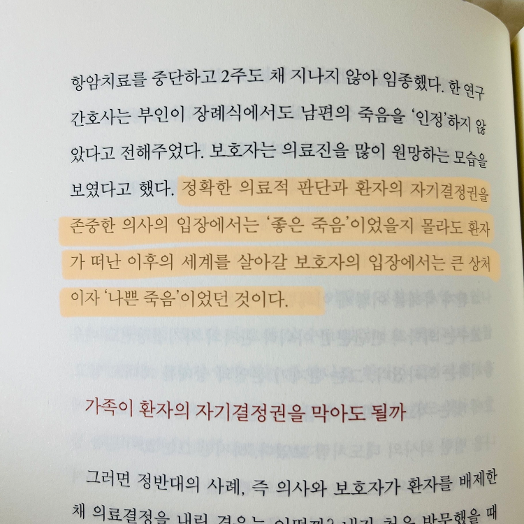 정확한 의료적 판단과 환자의 자기결정권을 존중한 의사의 입장에서는 '좋은 죽음'이었을지도 몰라도 환자가 떠난 이후의 세계를 살아가 보호자의 입장에서는 큰 상처이자 '나쁜 죽음'이었다.