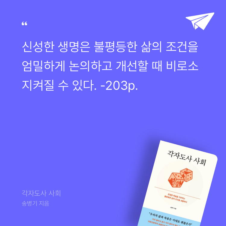 우리 삶이 불평등하면 할수록 주사위 놀이는 '아찔한 모험'이자 '합리적 투기'가 되어 세간의 관심을 끈다. 반면, 어떤 주사위를 던져도 누구나 존엄하게 살고, 늙고, 아프고, 죽을 수 있다면 그 놀이는 시시한 장난에 그칠 것이다.