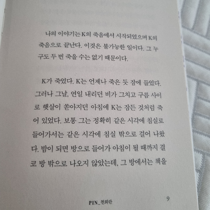 당대 한국 문학의 가장 현대적이면서도 첨예한 작가들을 선정, 신작 시와 소설을 수록하는 월간 『현대문학』의 특집 지면 '현대문학 핀 시리즈'의 마흔다섯 번째 소설선, 천희란의 <K의 장례>. 스스로 목숨을 끊은 작가 K의 죽음을 둘러싼 미스터리한 상황에서 전개되는 두 여자 소설가의 이야기다.