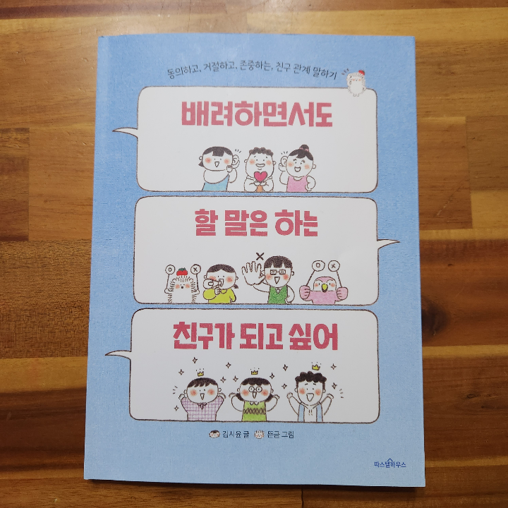 요약*배려하면서도 할 말은 하는 친구가 되고 싶어 (동의하고, 거절하고, 존중하는 친구 관계 말하기)*는 김시윤이 2023년 4월 4일 파스텔하우스에서 출간한 초등학생 대상 대화 기술 지침서로, ISBN 9791197494291을 통해 약 160쪽 분량으로 펴내졌다. 📖 저자는 초등학교 교사로, 10년 이상 학생 상담을 통해 친구 관계 고민을 해결하며 쌓은 경험을 바탕으로 이 책을 썼다. 뜬금의 만화 삽화와 함께, “나