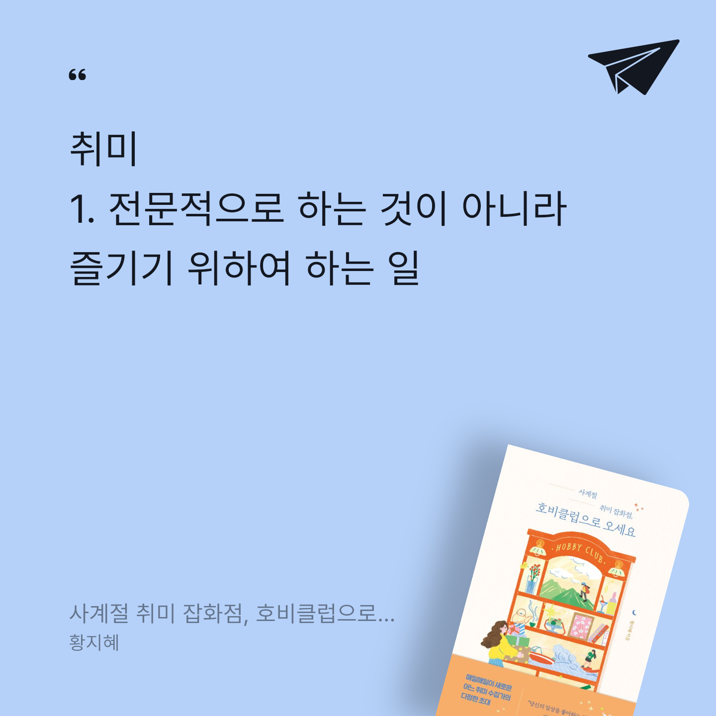 “좋아하는 게 많을수록 삶은 단단해지고, 세계는 넓어진다” 당신의 계절을 풍성하게 할 취미를 찾고 싶다면, 사계절 취미 잡화점, 호비클럽으로 오세요! 일상의 빛나는 순간들을 모으는 취미 수집가, 작은 기쁨을 차곡차곡 쌓아 커다란 행복을 만드는 작가 황지혜. 새로운 세계에 망설임 없이 뛰어드는 그는 혼자 도전하는 데 그치지 않고, ‘호비클럽’을 열어 사람들을 초대한다. 화분에 씨앗을 심어 싹을 틔우고, 막걸리를 만들어 나눠 마시고, 필름 카메라로 일상을 기록하는 등 다양한 방식으로 취미를 즐기고, 나만의 취향을 찾아간다. 좋아하는 마음을 따라 나를 발견하는 이 모든 여정의 끝에서 작가는 결론 내린다. 얼마나 자주, 얼마나 잘하는지와 상관없이, 내 삶을 풍성하게 해주는 모든 게 바로 취미라고. 햇볕을 쬐며 식물을 바라볼 때 느끼는 뿌듯함, 달릴 때 느껴지는 생생한 감각, 커피를 내려 마시면서 차분해지는 마음들. 한 단어로는 정리될 수 없는, 반짝이고 아름다운 취미의 순간들을 정성스럽게 써내려간다. 새로운 취미에 도전해보고 싶은데 망설여진다면, 내가 뭘 좋아하는지 알고 싶다면, 잡화점처럼 온갖 취미가 모여 있는 이 책을 펼쳐보자. 언제든 좋아하는 일에 풍덩 빠지는 작가의 이야기를 읽다 보면, 지금 당장 일어나 무언가를 시작하고 싶어질 것이다. 슬며시 새어나오는 그 마음을 놓치지 않도록, 나에 대해 더 깊이 생각해볼 수 있도록, 작가가 건네는 질문에 답을 써보는 ‘호비 노트’를 수록했다. 이 질문들이 당신의 마음을 간질여, 당신의 하루를, 당신의 마음을 자꾸 들여다보게 만들기를, 그래서 이 책을 읽고 나서 당신도 취미의 세계를 마음껏 유영할 수 있기를 바란다.