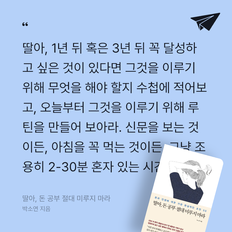 딸아, 너도 마찬가지다. 만약 네가 누구의 간섭도 받지 않고 원하는 것들을 해 나가고 싶다면, 그만큼 돈이 있어야 한다. 그러니 더 늦기 전에 돈 공부를 해라. 돈 공부를 미루면 미룰수록 네가 원하는 삶 또한 멀어질 수밖에 없을 것이다.
