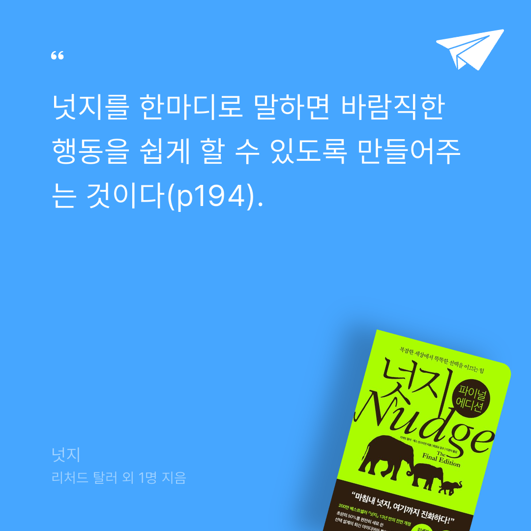 『넛지 (파이널 에디션│복잡한 세상에서 똑똑한 선택을 이끄는 힘)』(ISBN 9788901260679)은 행동경제학의 대가 리처드 H. 탈러(Richard H. Thaler)와 캐스 R. 선스타인(Cass R. Sunstein)의 공저로, 2022년 6월 20일 리더스북에서 이경식 번역, 최정규 감수로 출간된 개정판이다. 📖 약 432페이지로 구성된 이 책은 2008년 초판 『넛지』(Nudge)가 200만 부 판매와 2017년 탈러의 노벨경제학상