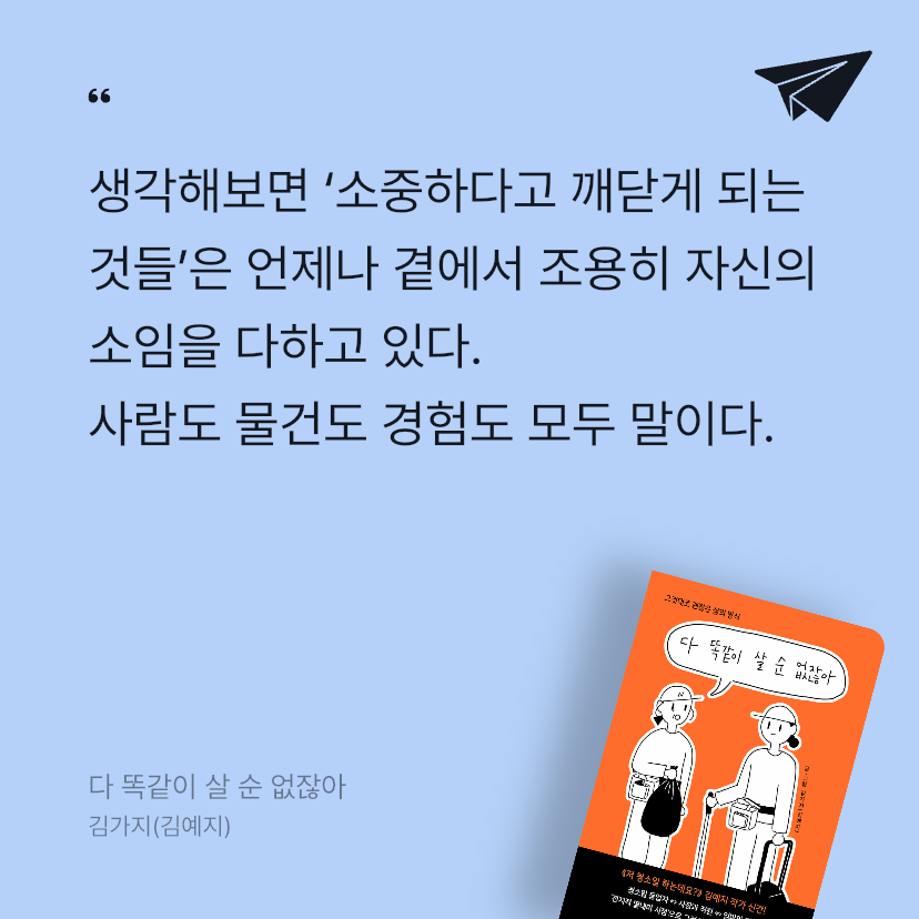 독립출판계를 흔들었던 <저 청소일 하는데요?>의 김예지 저자(필명 김가지)가 3년 만에 새로운 이야기를 들고 독자들을 찾아왔다. 전작이 20대 청년의 진로와 인생에 대한 고민이 담긴 책이었다면 <다 똑같이 살 순 없잖아>는 30대 청년이 가지고 있는 삶의 방향성과 부모로부터 완전한 독립에 대한 고민이 담겨 있다.