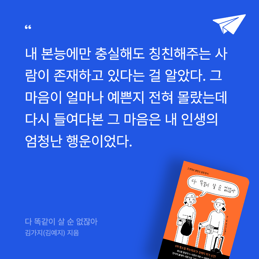 요약『다 똑같이 살 순 없잖아 (그것대로 괜찮은 삶의 방식)』은 김예지(필명 김가지)가 2023년 5월 15일 다크호스를 통해 출간한 에세이로, 약 280쪽 분량의 책이다(ISBN: 9791198092342). 독립출판 『저 청소일 하는데요?』로 화제를 모은 저자는 청소 일을 하며 그림을 그리는 생계형 작가로, “남과 다르게 살아도 괜찮다”는 메시지를 통해 20대 청춘의 방황과 성장을 솔직히 풀어낸다. 전작의 후속작으로, 청소 일을 선택한 이후의 삶, 가족과의