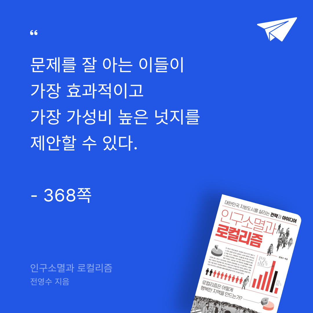 인구 충격을 혁신의 기회로 바꿀 새로운 로컬리즘 제안. 생사의 기로에 선 대한민국 지방도시를 위한 다양한 전략과 아이디어로 채워졌다. 우리는 최신 이론과 선진 사례를 등대 삼아 우리만의 항해법으로 깜깜한 바다를 헤쳐 나가야 한다.