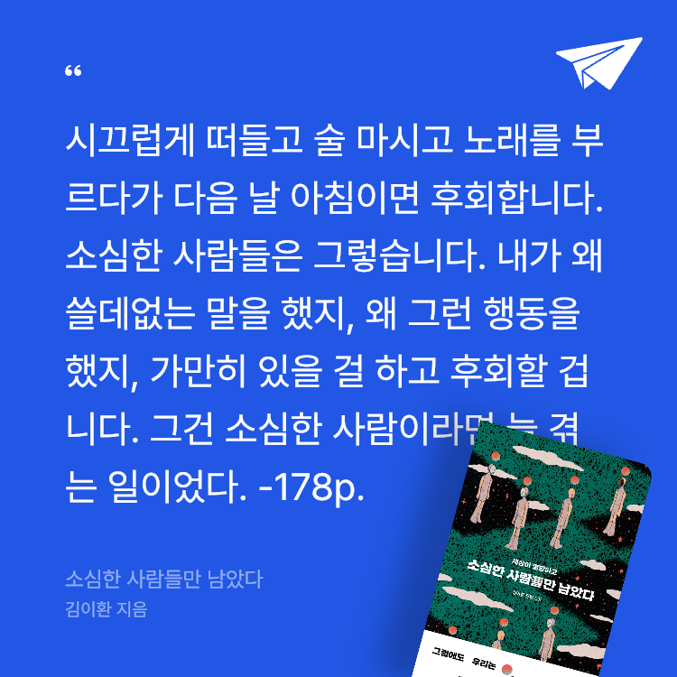 요약소심한 사람들만 남았다는 김이환 작가가 2023년 6월 30일 북다 출판사를 통해 출간한 장편 SF 소설로, ISBN은 9791170610120이다. 📖 2009년 절망의 구로 멀티문학상을 수상하며 주목받은 김이환은 7년 만에 발표한 이 작품에서 정체불명의 수면 바이러스로 인해 대부분의 인류가 잠든 세상을 배경으로, ‘소심함’이라는 공통점을 가진 생존자들의 이야기를 유머와 따뜻함으로 그린다. 조선일보는 “팬데믹 이후의 세상을 블랙코미디로 풀어낸 독창적 서사”로 평가했으며, 예스