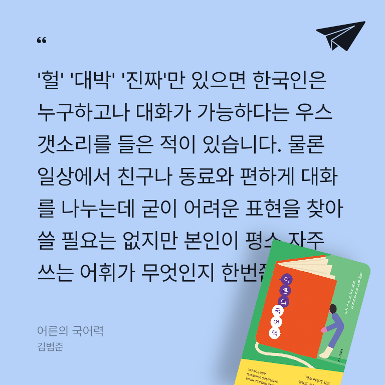 다른 것을 포기하면 삶이 멈추지는 않는다. 그러나 국어를 더는 고민하지 않고 포기해버리면 삶은 흐려지고 종국에는 위태로워진다. 이제 『어른의 국어력』을 통해 읽기를, 읽기를 통해 말하기를, 말하기를 통해 쓰기를 배우며 말과 글에 품격을 더해 삶의 해상도를 높이고, 정제된 텍스트로 자신을 세상에 내보이는 법을 익힐 시간이다.
