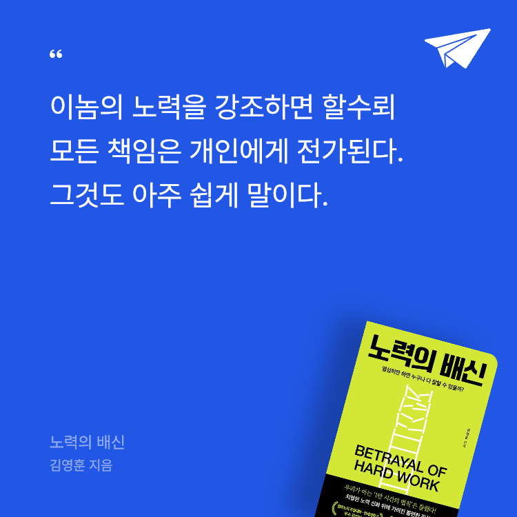 요약『노력의 배신 (열심히만 하면 누구나 다 잘할 수 있을까?)』는 연세대학교 심리학과 김영훈 교수가 2018년 21세기북스에서 출간한 심리학 기반의 자기계발서다. 📖 이 책은 “열심히 하면 누구나 성공한다”는 한국 사회의 노력 신봉 문화를 비판하며, 노력과 재능, 환경의 상호작용을 과학적으로 분석한다. 저자는 말콤 글래드웰의 ‘1만 시간의 법칙’을 재해석하며, 노력이 성공의 유일한 열쇠라는 믿음이 오히려 개인과 사회에 해를 끼칠 수 있다고 주장한다. 심리