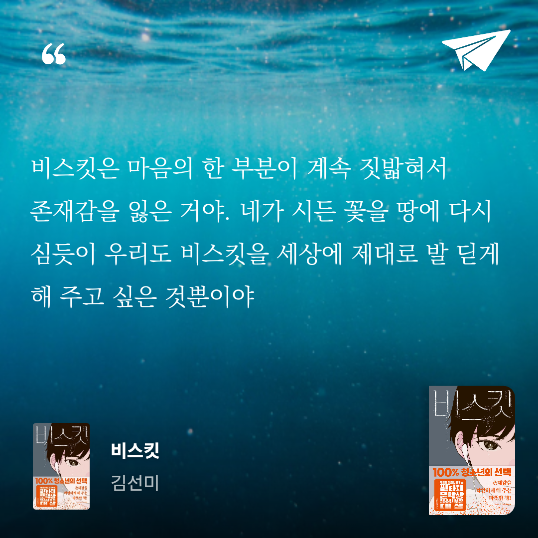 제1회 위즈덤하우스 판타지문학상 청소년 부문 대상 수상작. 『비스킷』은 자신을 지키는 힘을 잃어 보이지 않게 된 존재인 ‘비스킷’을 돕고자 하는 한 소년의 고군분투이자, 자존감을 지키기 위해 몸부림치는 청소년의 성장통 같은 작품이다.