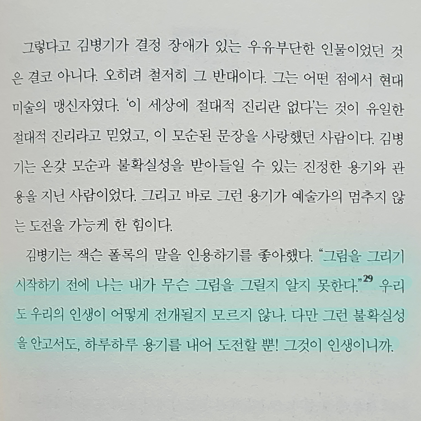 저자는 타고난 이야기꾼임이 분명하다. 원래도 극적이었을 예술가들의 삶에 어찌나 멋진 제목을 붙여두었는지. 제목만으로도 가슴이 설레고, 그 안의 이야기가 궁금해졌다. 내 마음을 가장 설레게 한 제목은 “그럼에도 삶은 총체적으로 환희다”였다. 국가등록문화제인 '남향집'을 그린 오지호에 관한 이야기였는데, 전혀 몰랐던 그의 삶에서 느끼는 바가 무척 많았다. “어둠 속에 직면해 고통을 겪으면서도, 그 고통에 매몰되지 않는 굳건한 정신세계를 지녔기에 빛나는 결과물을 만들어냈던 것(p.263)”이라는 말이 마음에 짙게 남는다. 어쩌면 우리는 훨씬 나은 환경에 살면서도 '못하는 이유'를 만들어대지 않나. 고난이 와도 삶은 총체적으로 환희라는 말을 읽는 내내 그동안의 나는 용기가 없어서 하지 못 할 이유만을 찾아왔던 것은 아닌지, 반성의 마음이 들었다. 그리고, 내 삶이 어쨌든 총체적으로 환희가 될 수 있도록 더 부지런히 행복하리라 결심했다.