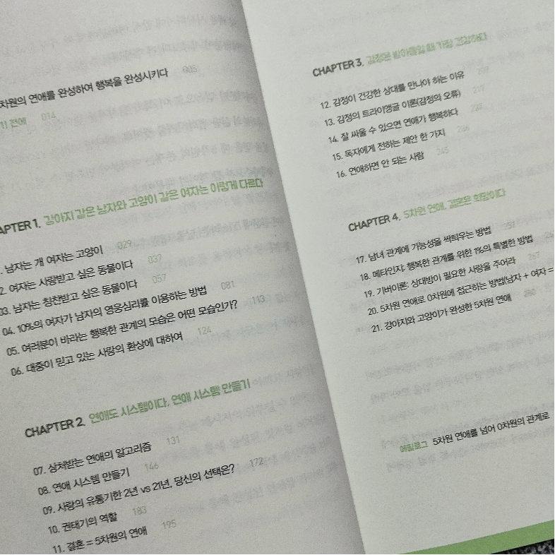 요약**5차원 연애 (남자는 개, 여자는 고양이, 연애의 알고리즘)**은 이훈만의 자기계발서로, 미다스북스에서 2023년 9월 21일 출간되었다(ISBN: 9791169103329). 약 300쪽 분량의 이 책은 연애와 인간관계를 독창적인 ‘5차원’ 관점에서 탐구하며, 남성과 여성의 본성을 각각 ‘개’와 ‘고양이’로 비유해 연애의 성공 비결을 제시한다. 저자 이훈만은 심리학 기반의 관계 코칭 전문가로, 다년간의 상담 경험을 바탕으로 연애의
