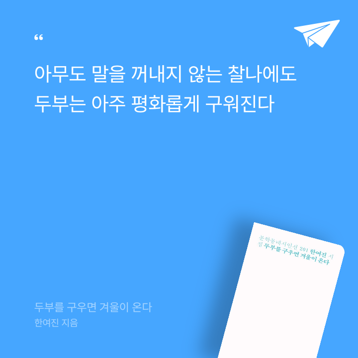 문학동네시인선 201번으로 한여진 시인의 첫번째 시집 『두부를 구우면 겨울이 온다』를 펴낸다. 2019년 문학동네신인상을 통해 작품활동을 시작한 시인의 시 48편을 골라 엮었다.