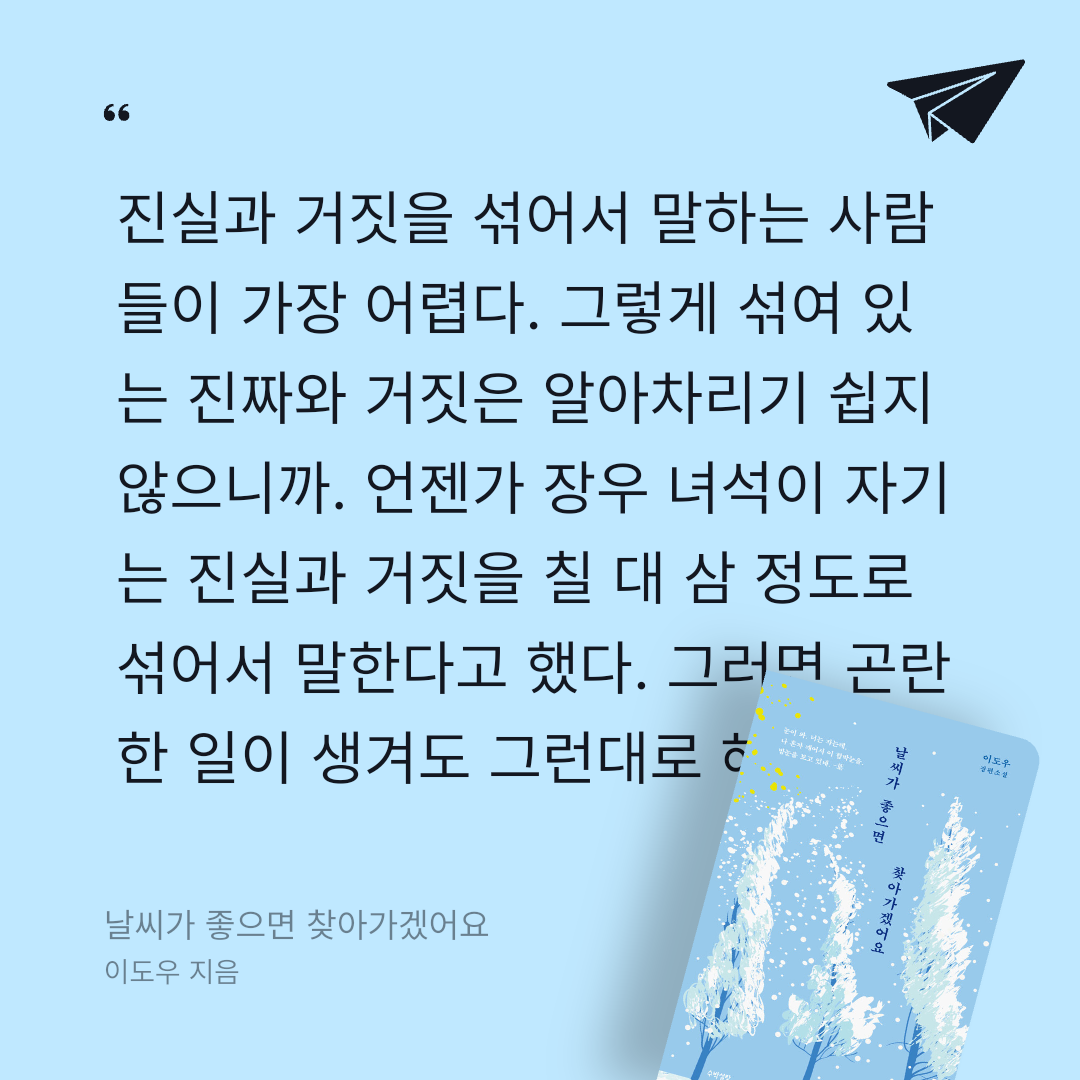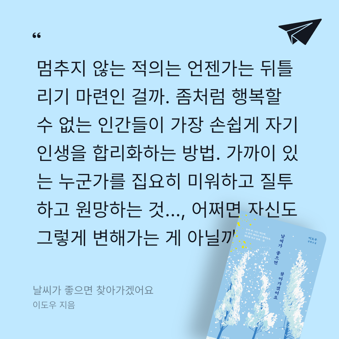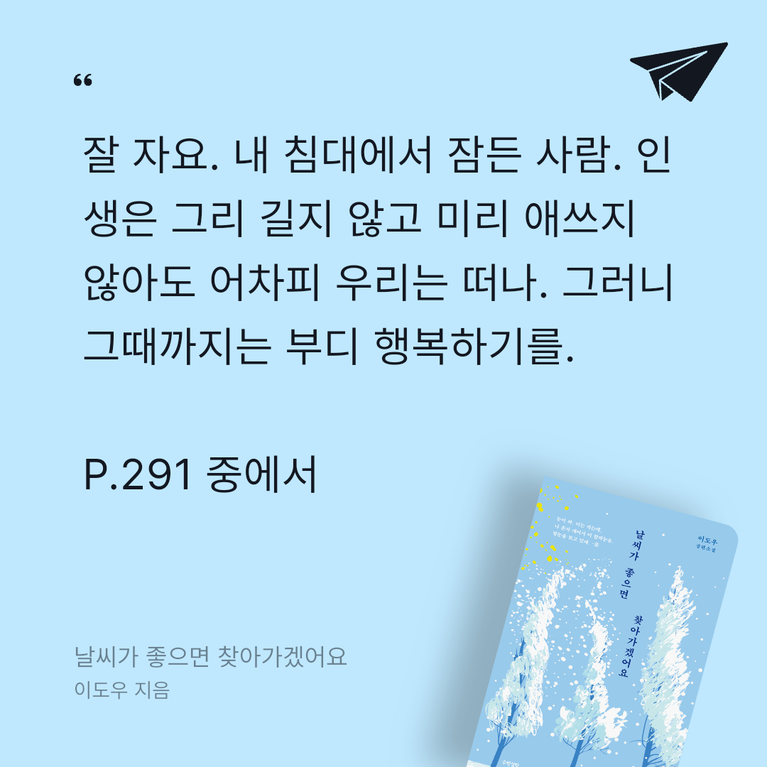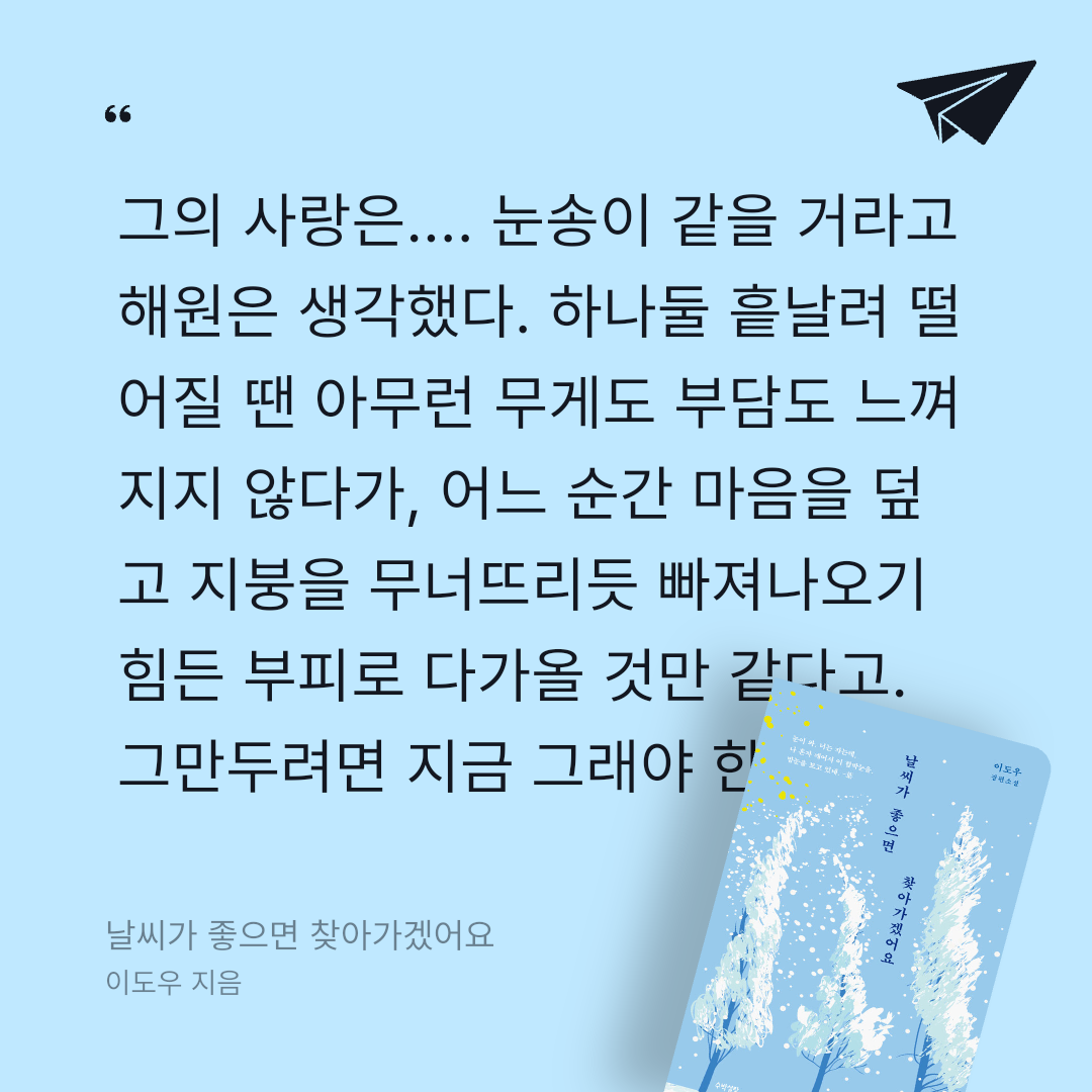요약날씨가 좋으면 찾아가겠어요는 이도우 작가의 장편소설로, 2018년 시공사에서 첫 출간된 후 2023년 수박설탕에서 양장본으로 재출간되었다. 📖 강원도 북현리의 작은 독립서점 ‘굿나잇책방’을 배경으로, 상처 입은 두 영혼이 서로를 치유하며 사랑을 키워가는 이야기를 그린다. 이도우의 서정적이고 따뜻한 문체는 독자들에게 ‘천천히 오래 아끼며 읽고 싶은 책’이라는 평을 받으며, 50만 부 이상 판매된 스테디셀러로 자리 잡았다.
