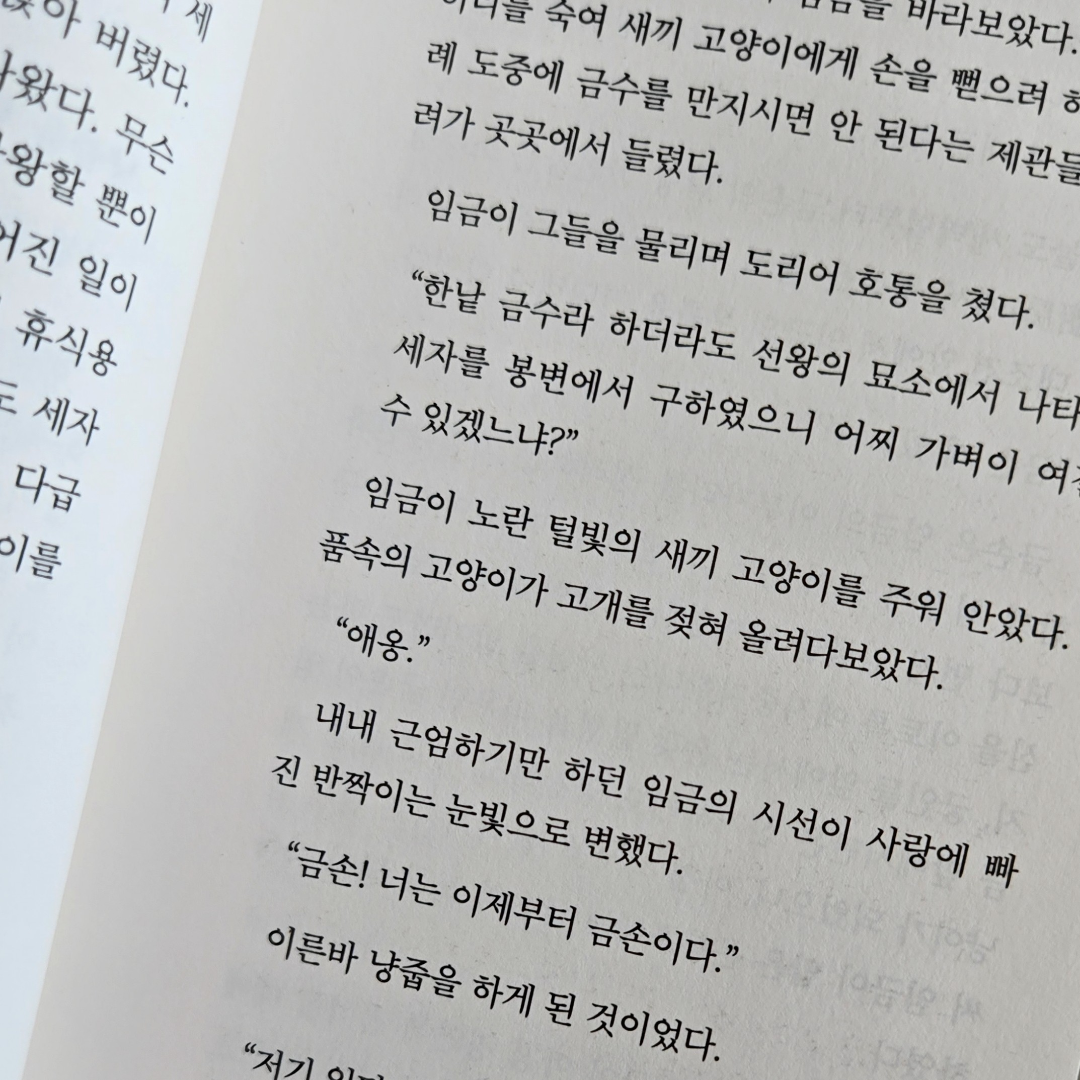 조선의 왕 숙종은 어느 날 고양이 한 마리와 마주친다. 왕은 그 고양이를 어여삐 여겨 곁에 두었고, 고양이 또한 왕을 잘 따랐다. 여러 문헌을 통해 전해지는 이 ‘냥줍’을 애묘인인 작가와 안전가옥의 스토리 PD가 유쾌한 퓨전 사극이자 추리 활극으로 재구성했다.