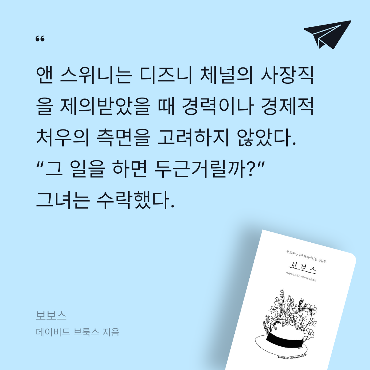 보보스가 행한 여러 일들 중 내가 가장 고맙게 여기는 것은 인종, 종교, 성별에 대한 차별을 타파하는 데 앞장 섰다는 점과 강력한 위계질서를 중심으로 운영되던 직장 문화를 개인의 자유와 창의성을 중시하는 방향으로 이동시켰다는 점이다.