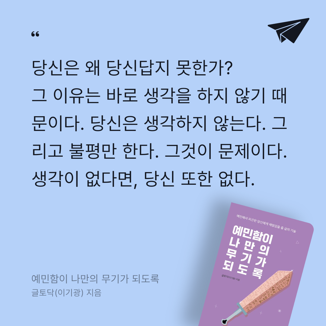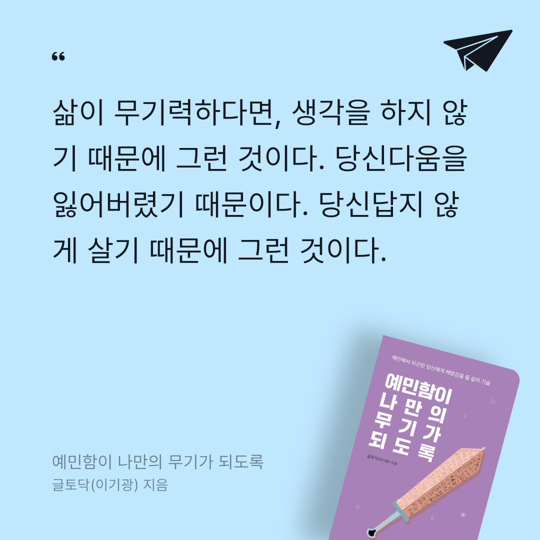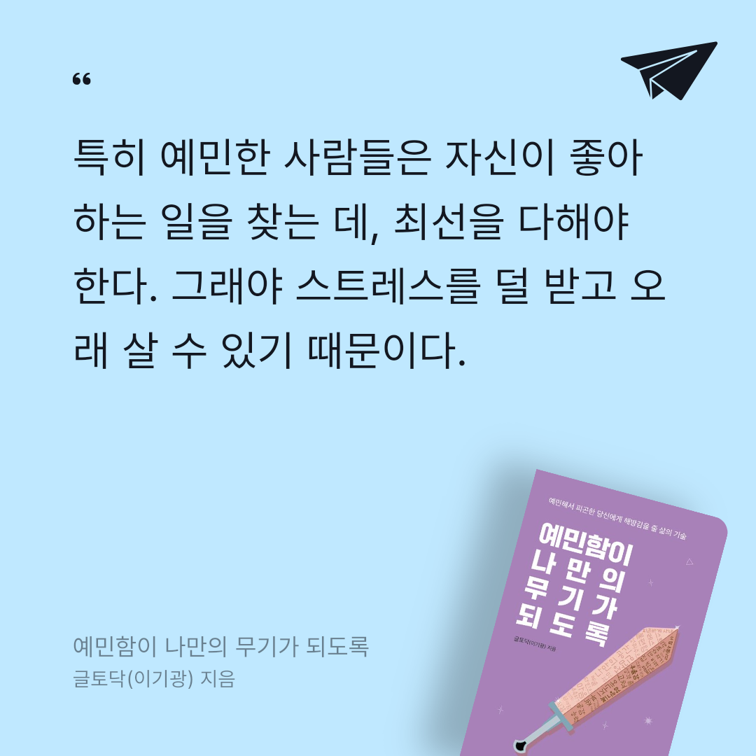 위로와 희망, 긍정적 동기를 전하는 콘텐츠로 사랑받는 크리에이터, 글토닥 작가가 신간으로 돌아왔다. 이번 책에는 예민한 성향 때문에 힘들어하는 사람들을 위해, 예민함을 잘 다루는 방법에 대해 담았다.