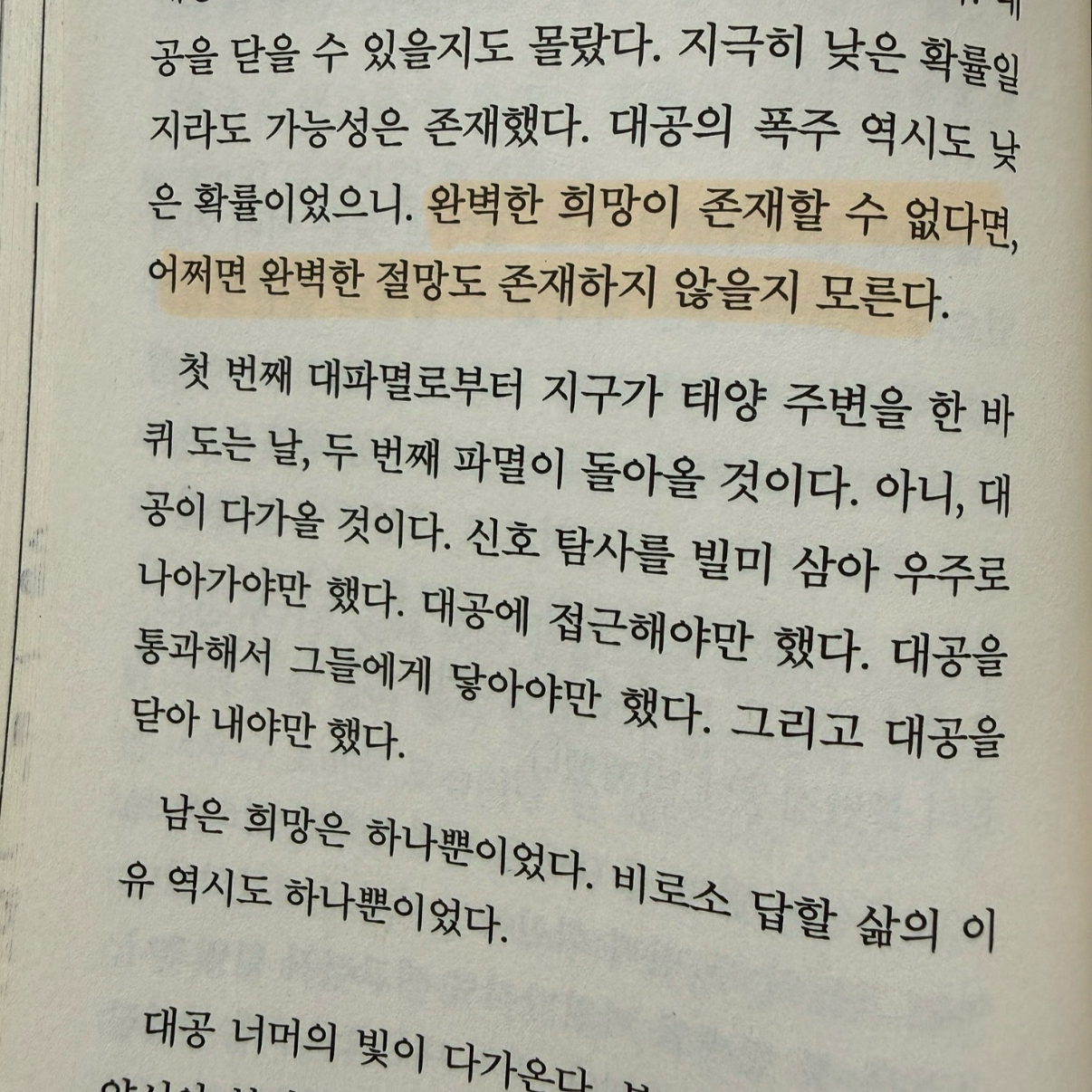 한국물리학회 SF어워드 가작이었던 〈마지막 선물〉을 경장편으로 확장시킨 작품으로, 천체물리학자 백영과 양서아가 지구 전체의 재앙을 초래한 ‘대파멸’로부터 서로를 구하고자 애쓰는 SF 로맨스 소설이다.