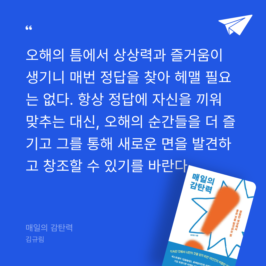 베스트셀러 《일놀놀일》, 前배달의민족 마케터, 성수동을 뜨겁게 달군 화제의 팝업 ‘뉴믹스커피’까지, 힙한 라이프 스타일로 MZ세대의 워너비가 된 마케터 김규림. 저자는 《매일의 감탄력》을 통해 나답게 살아가는 기반이 되어 준 특별한 ‘일상력’을 이야기한다. 이 책은 생활인으로서, ‘일잘러’로서의 모습이 모두 담긴 가장 ‘김규림다운’ 완성판이다.