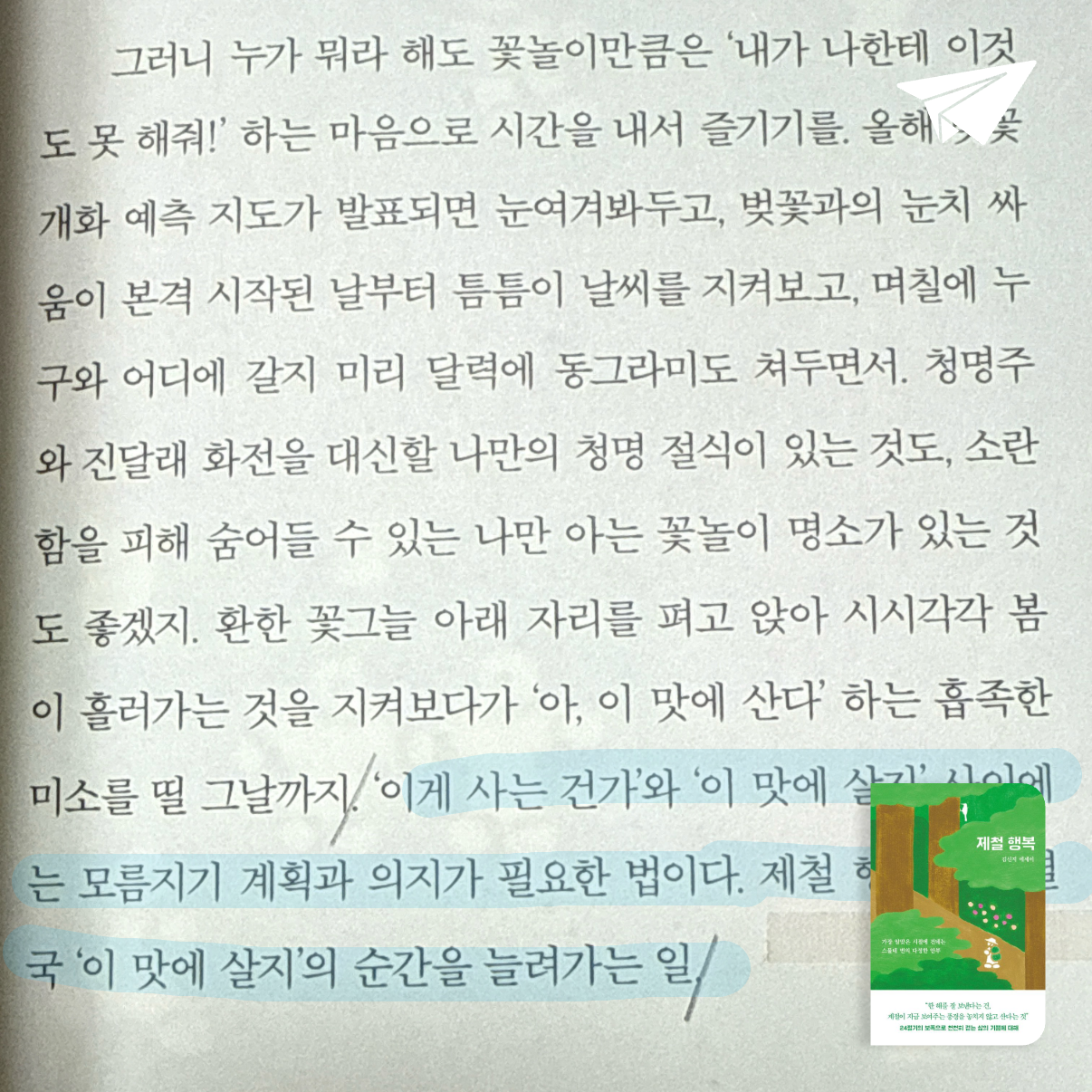 요약제철 행복은 김신지 작가가 계절의 흐름에 맞춰 스물네 번의 다정한 메시지를 건네는 에세이다. 📖 이 책은 24절기를 중심으로, 각 시기에 어울리는 자연의 변화와 삶의 순간을 섬세하게 포착한다. 저자는 계절마다 피어나는 꽃, 바람의 온도, 햇살의 각도 같은 일상의 풍경을 통해 독자에게 위로와 공감을 전한다. 책은 단순히 자연을 묘사하는 데 그치지 않고, 그 안에서 우리가 느끼는 감정과 삶의 리듬을 연결한다. 예를 들어, 입춘에는 새봄의 설렘을,
